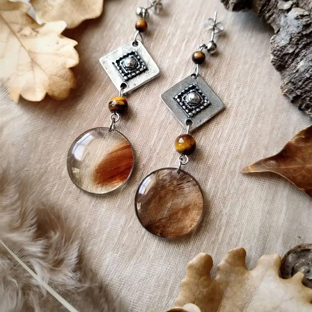 Paire de boucles d’oreilles pendantes composées de clous en acier inoxydable, de perles de pierre gemme semi précieuse d’oeil de tigre, de breloques ethniques en métal argenté vieilli et de médaillons ronds en résine époxy avec inclusion de plumes de perdrix trouvées dans la nature.