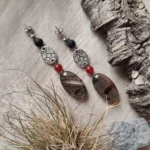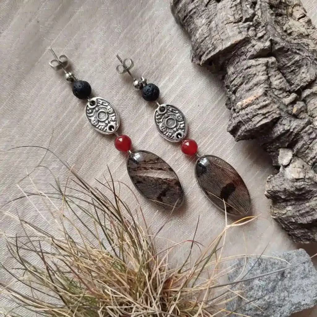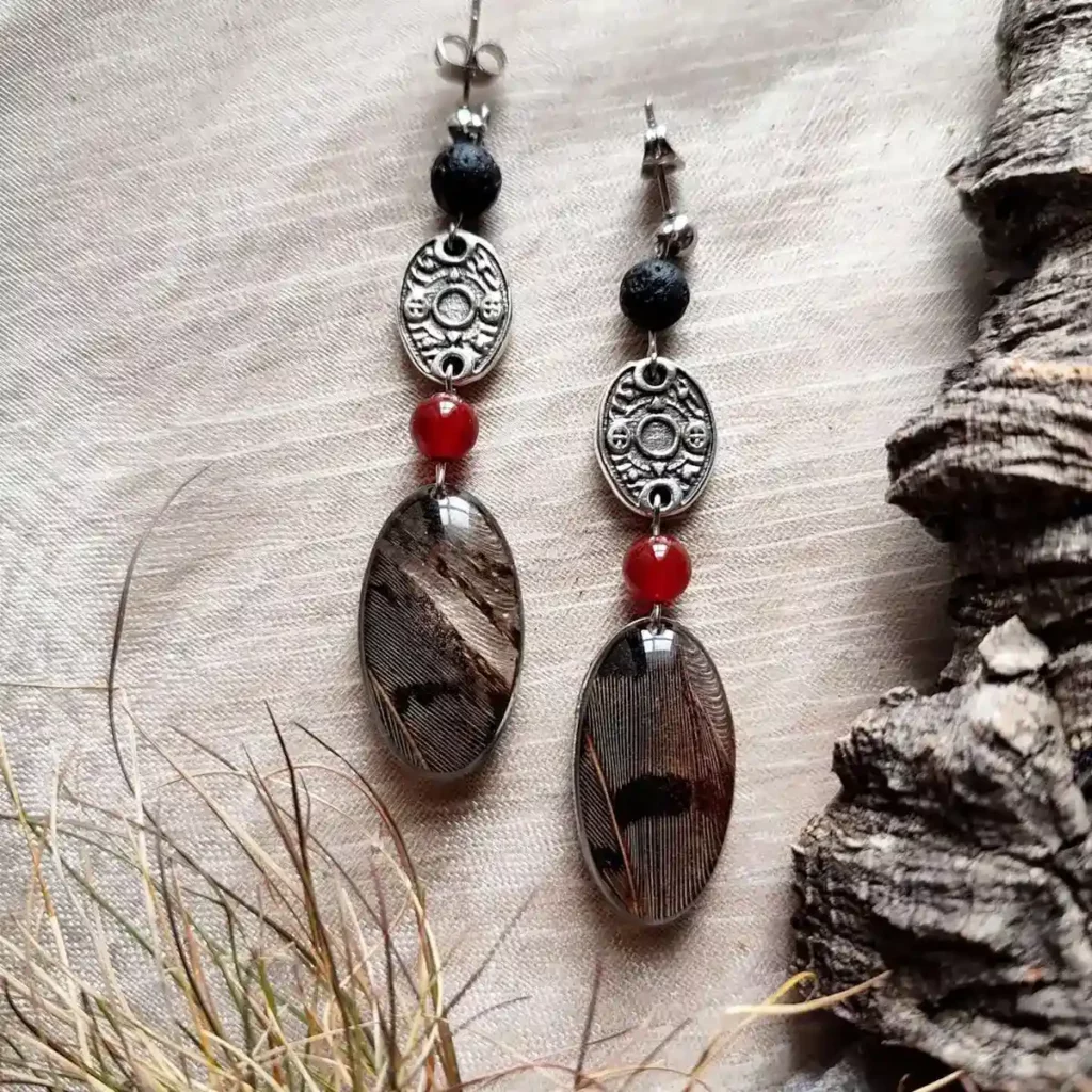 Paire de boucles d’oreilles pendantes ovales composées de médaillons en résine époxy avec inclusion de morceaux de plumes de faisan, perles de pierre gemme semi précieuse d’agate rouge et de pierre de lave, clous et intercalaire en acier inoxydable.