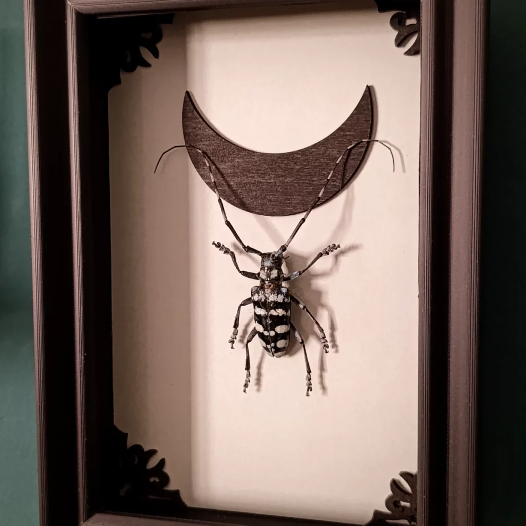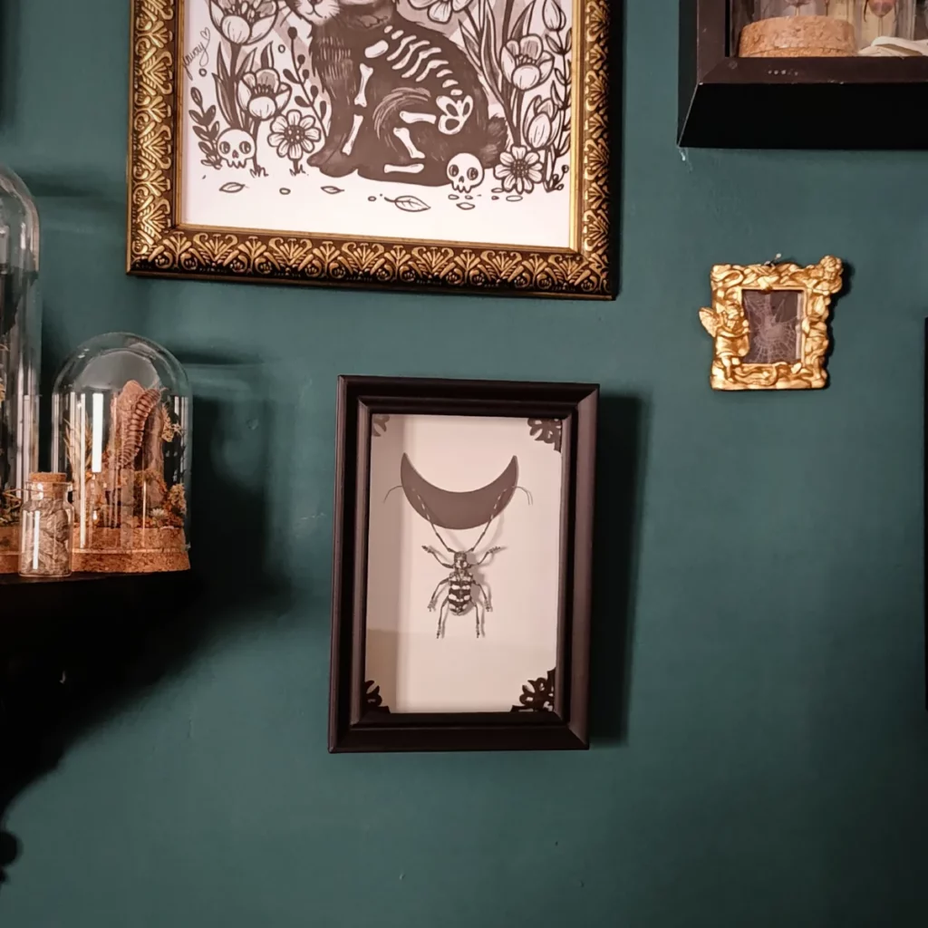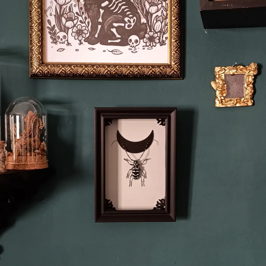 Ce cadre s’inscrit dans un univers mêlant cabinet de curiosités, esthétique gothique et poésie naturelle.