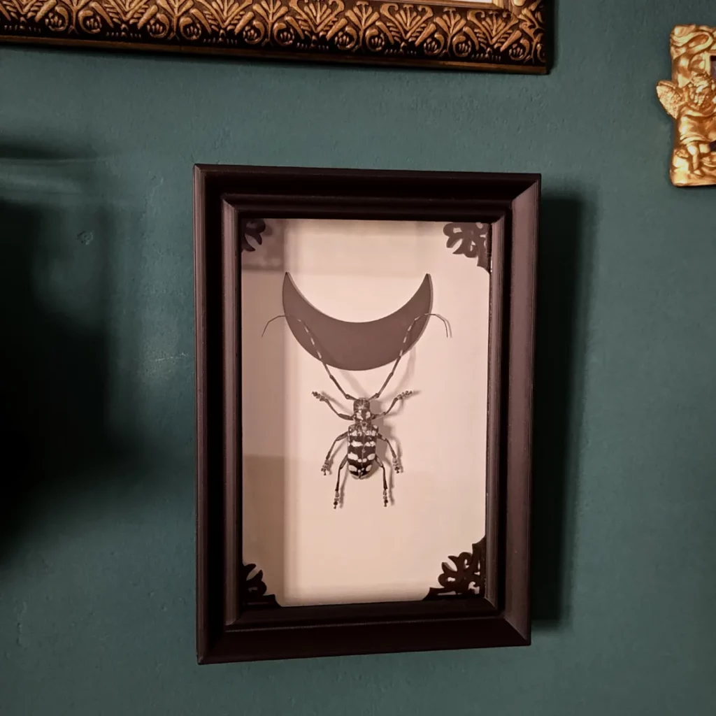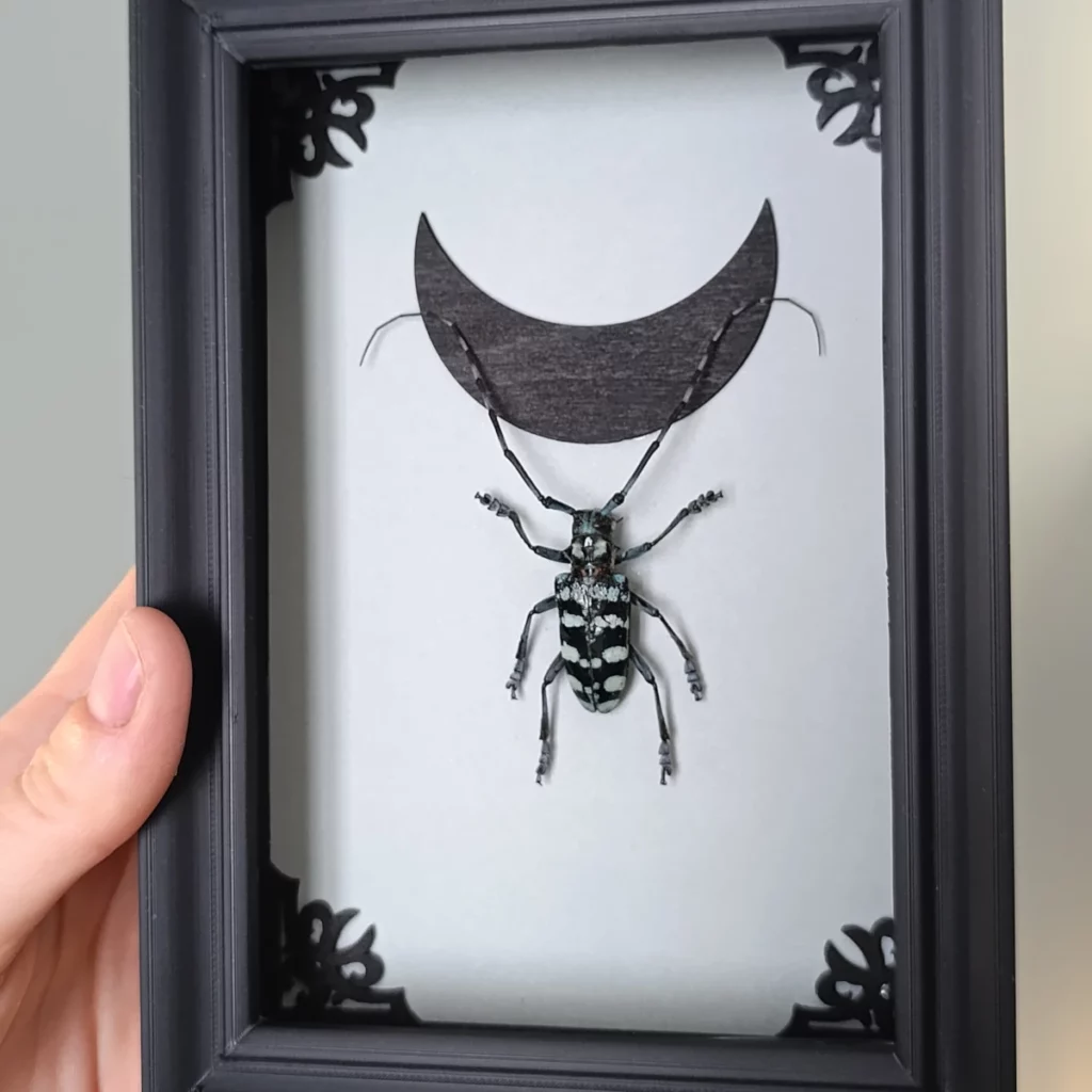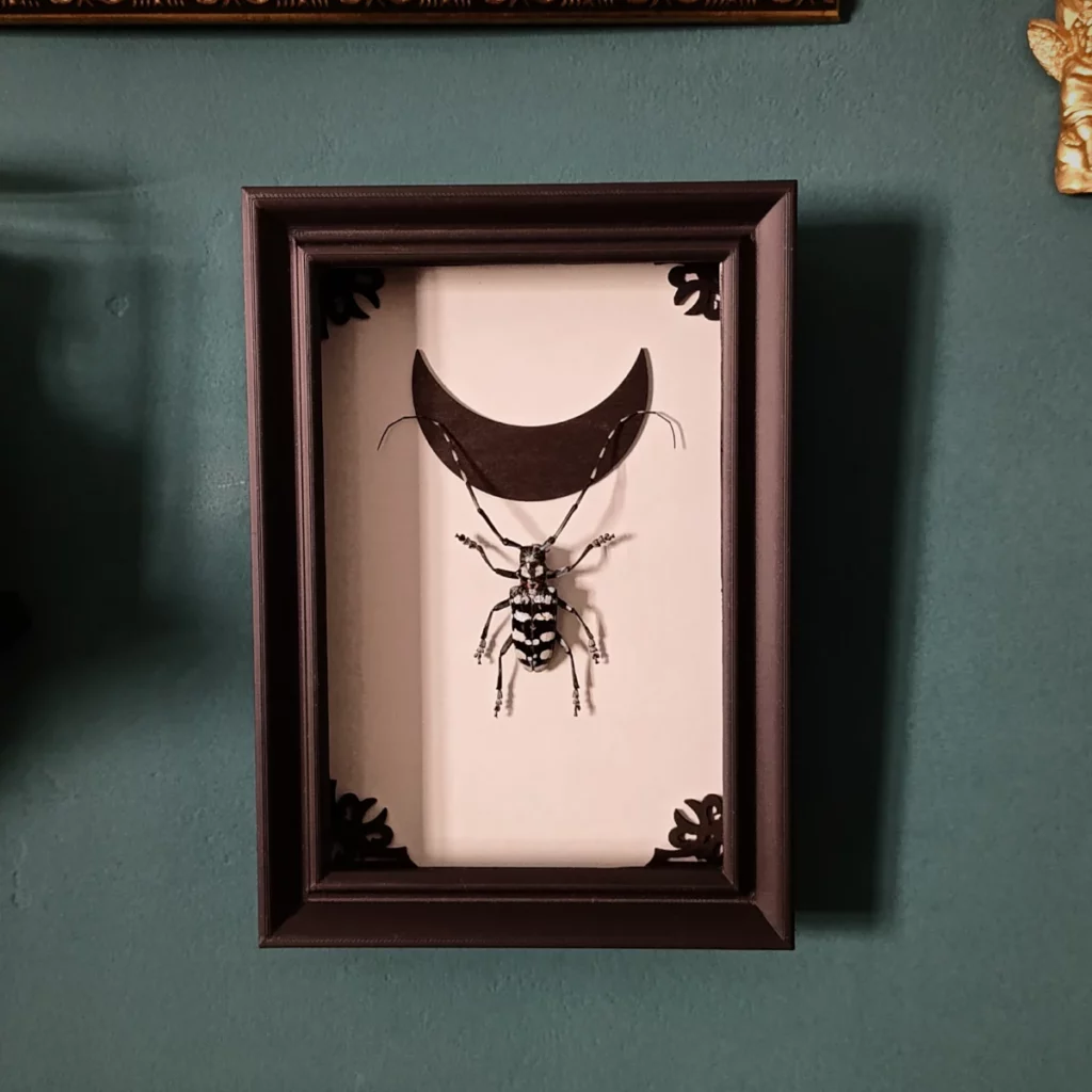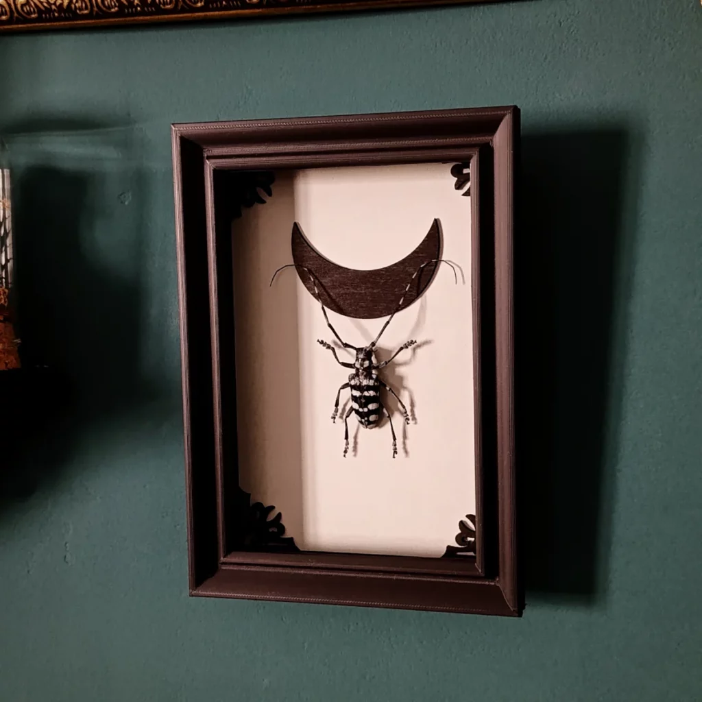 Ce cadre s’inscrit dans un univers mêlant cabinet de curiosités, esthétique gothique et poésie naturelle.