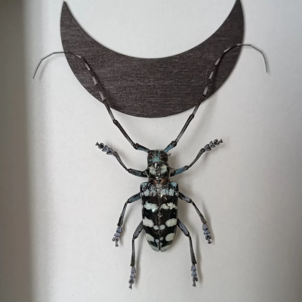 La silhouette du longicorne, associée à la lune noire, évoque la nuit, le mystère et la beauté du monde vivant.