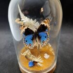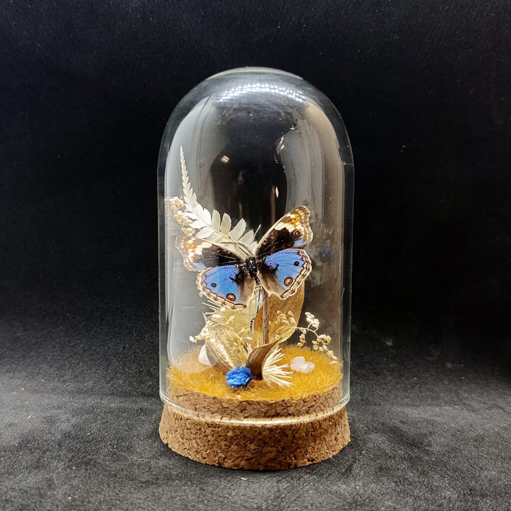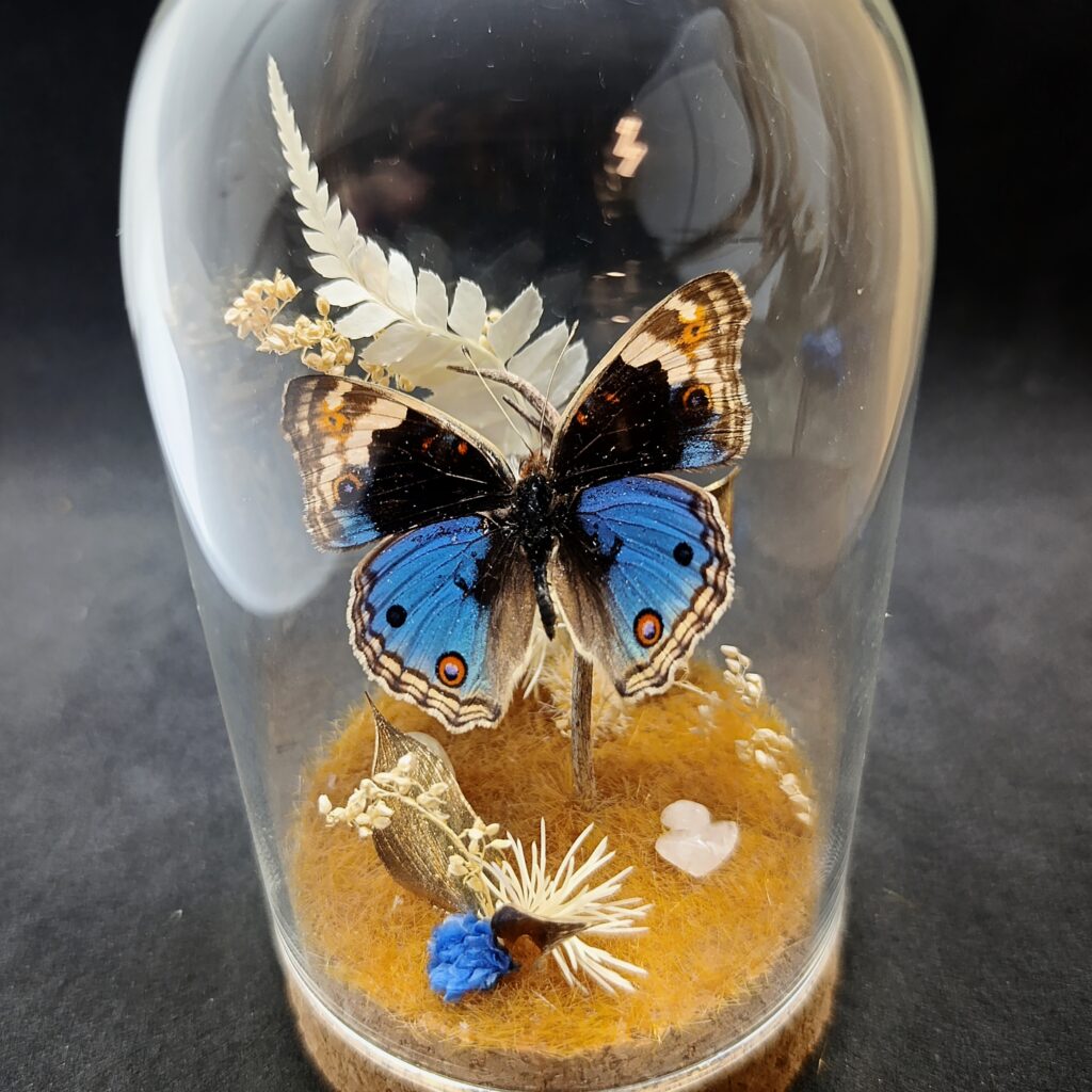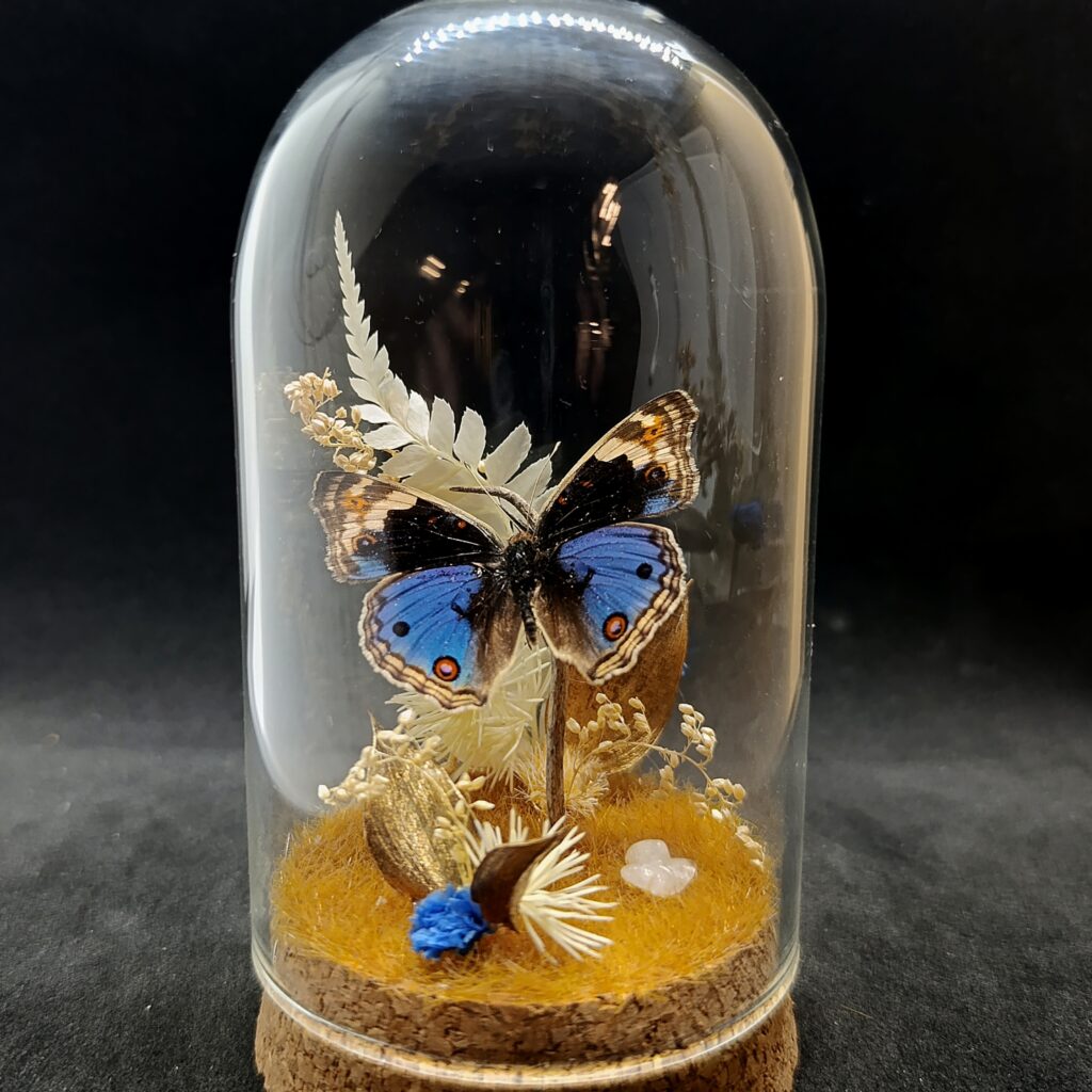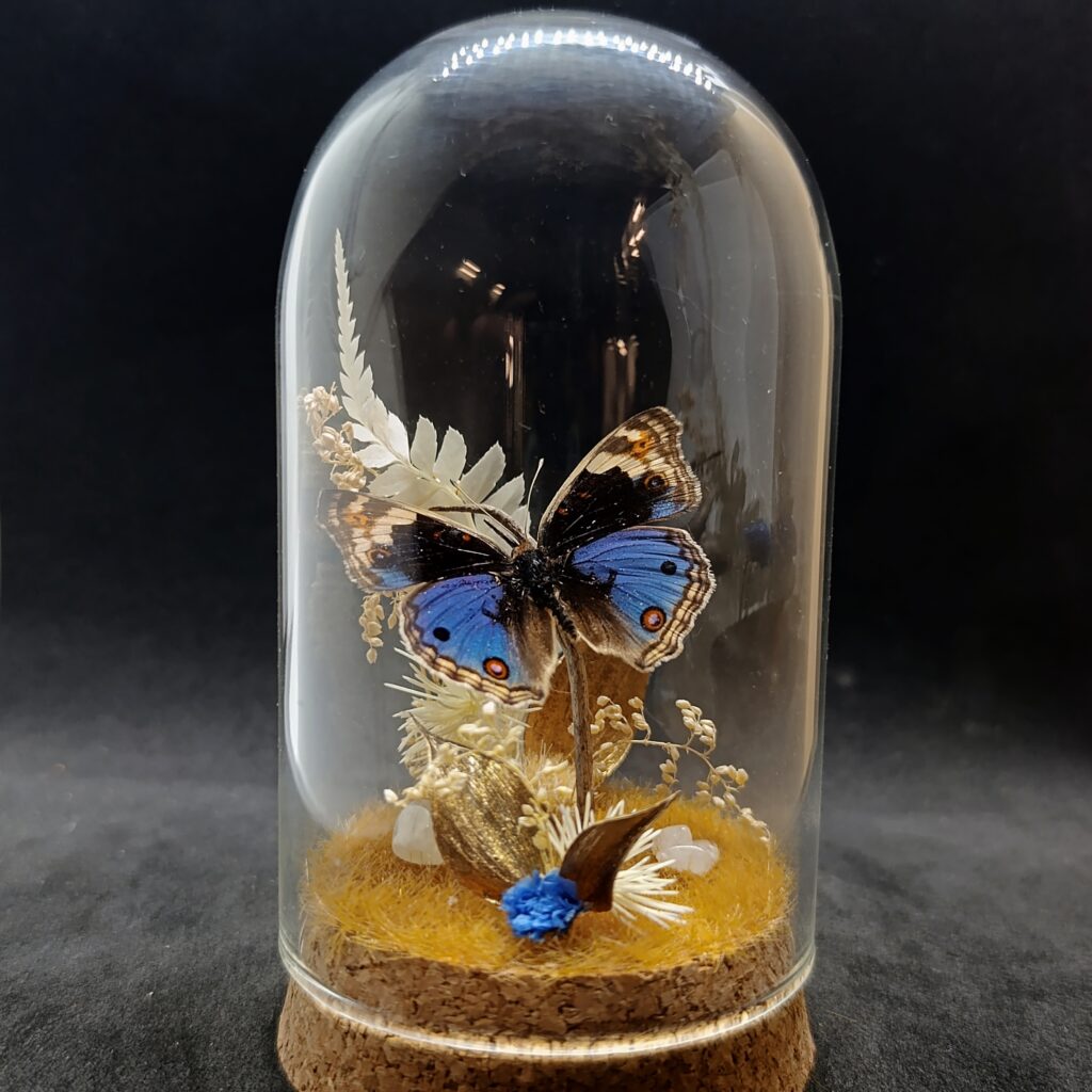 Apportez une touche de nature précieuse et colorée à votre intérieur avec cette cloche entomologique mettant en scène un papillon naturalisé : le Junonia orithya, reconnaissable à ses ailes bleu électrique bordées de noir et ponctuées d’ocelles orangés.