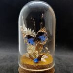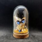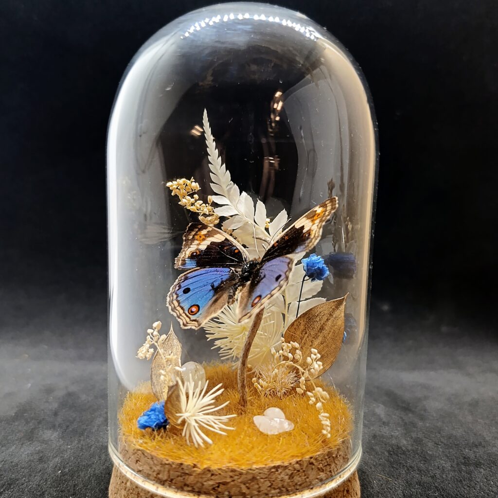 Ce diorama évoque un fragment de jardin imaginaire figé dans le temps. Le papillon, suspendu dans son envol, est mis en valeur par une palette végétale douce et lumineuse. Une pièce idéale pour les amoureux de la nature, les passionnés d’entomologie ou les amateurs de décoration poétique.