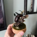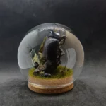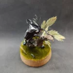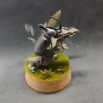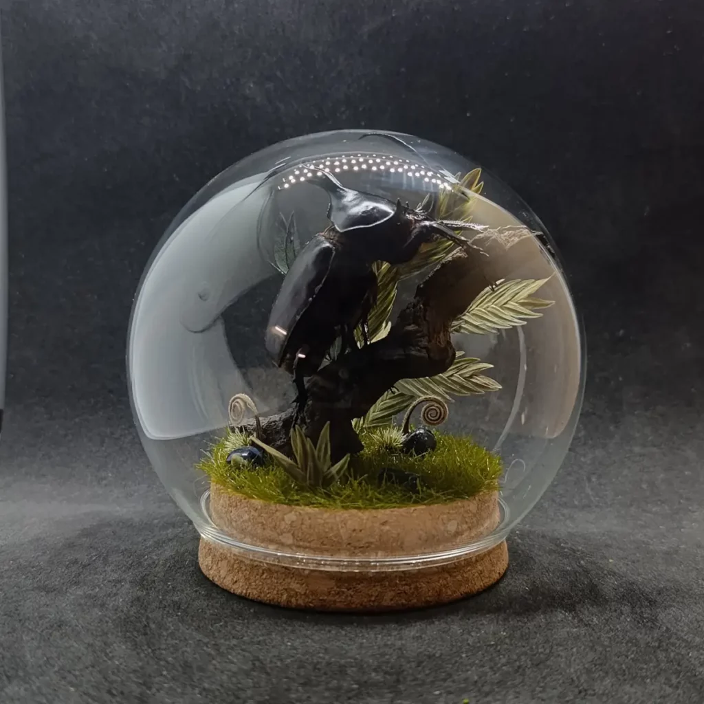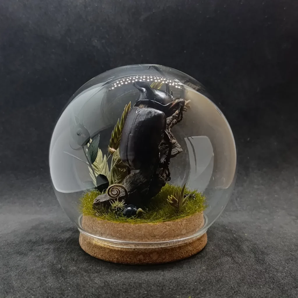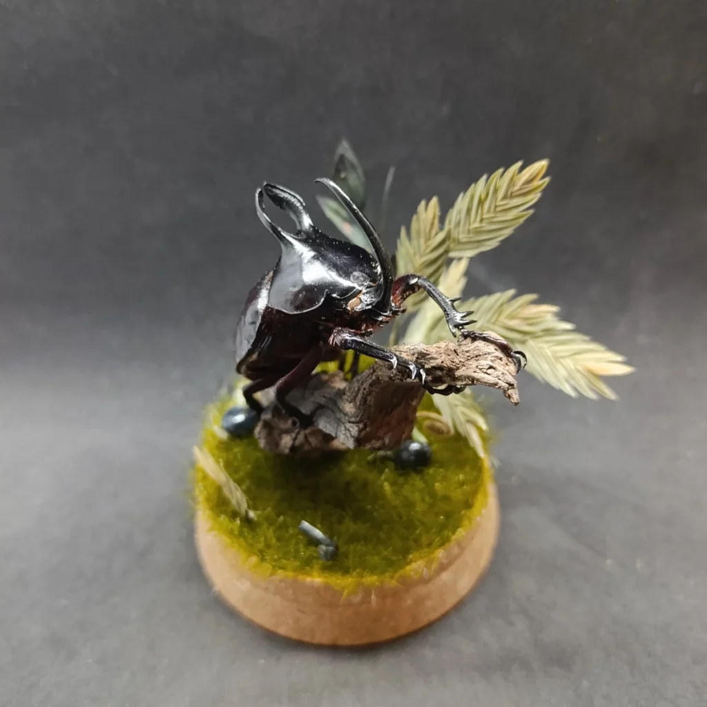 Ce globe entomologique met en valeur un Eupatorus birmanicus naturalisé, coléoptère originaire d’Asie du Sud‑Est, reconnaissable à sa silhouette compacte et à ses deux cornes céphaliques dressées, évoquant presque des oreilles. Le spécimen est fixé sur une branche texturée, dans une mise en scène qui rappelle les sous‑bois denses et les reliquaires forestiers.