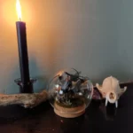 La base accueille une composition végétale miniature mêlant fougères stabilisées et autres végétaux sélectionnés pour leurs textures et leurs formes, associés à des fragments de bois. L’ensemble crée une atmosphère immersive, entre observation scientifique et poésie naturaliste.