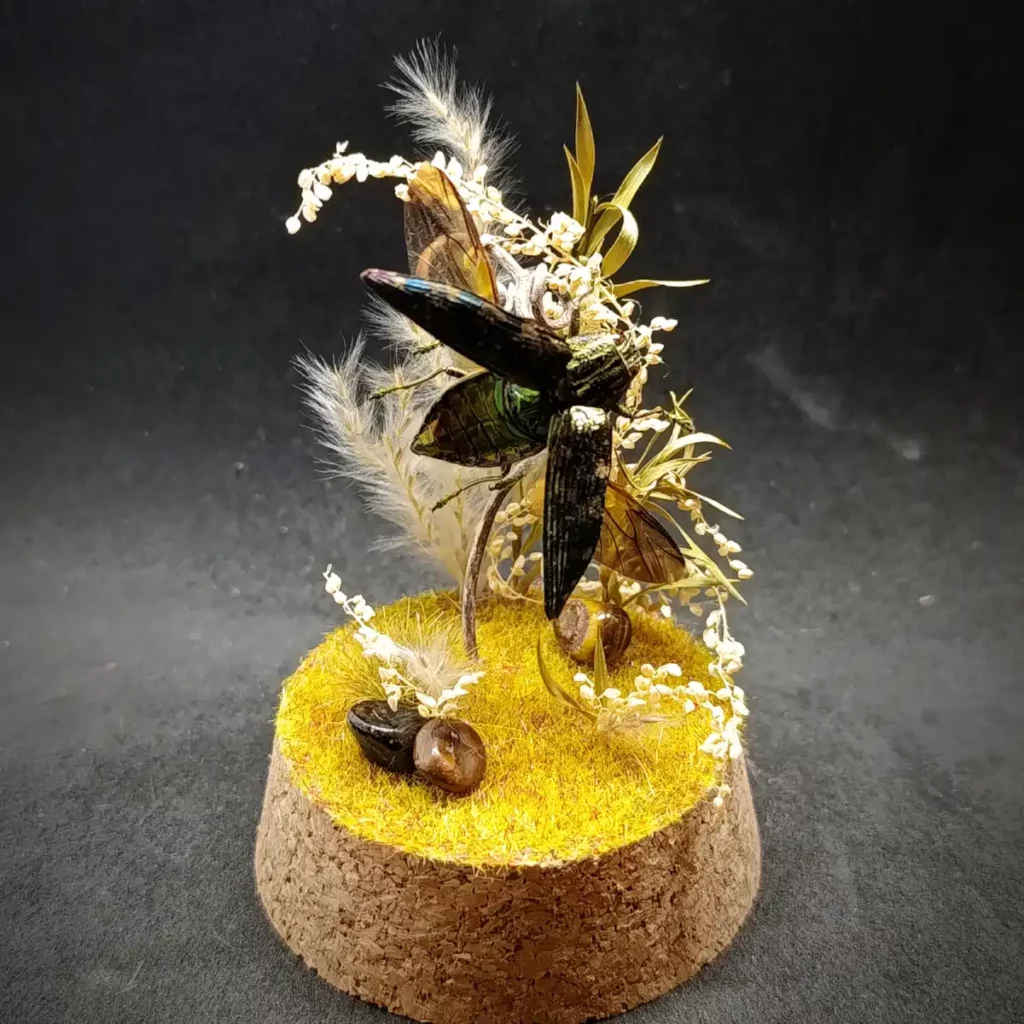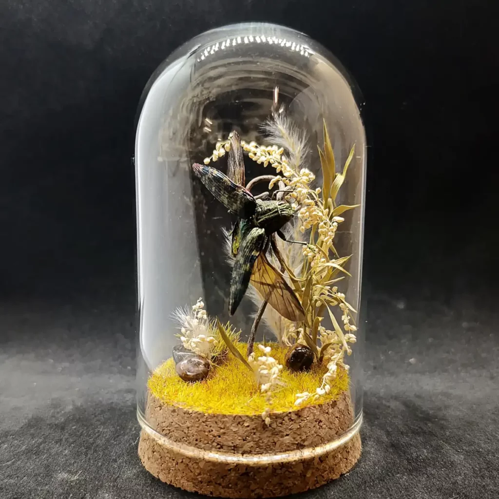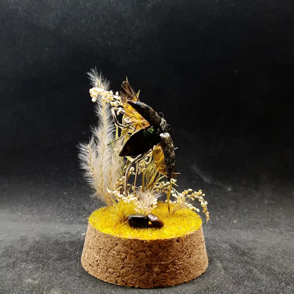 Protégé sous un dôme en verre et reposant sur un socle en liège, cette pièce éthique et unique trouvera parfaitement sa place dans une collection ou un intérieur recherchant une touche de nature élégante. Dimensions idéales pour l’exposition.