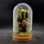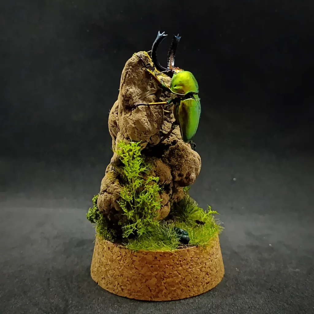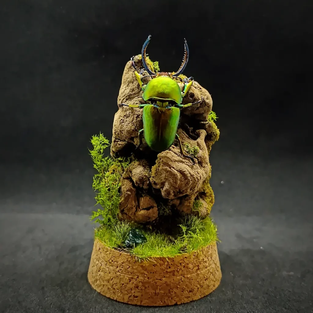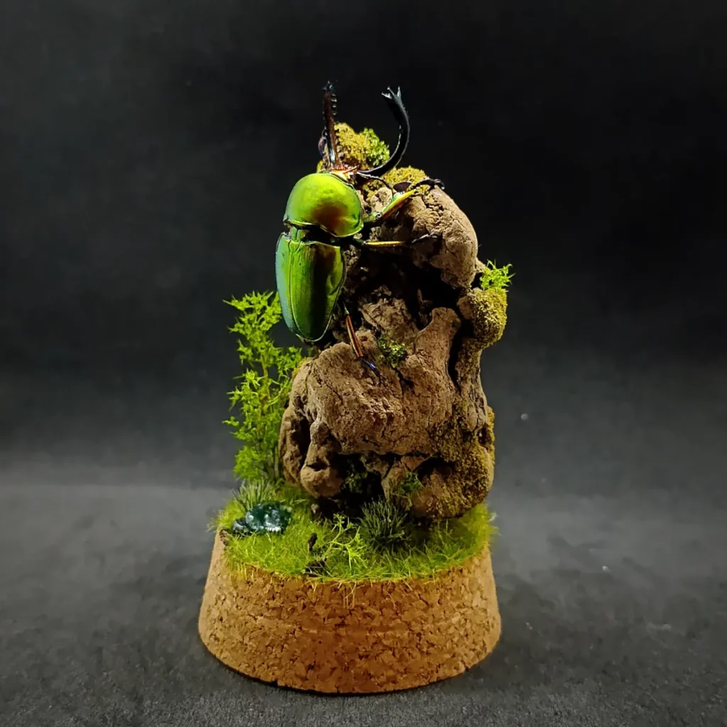 Voici une pièce unique mettant en valeur un magnifique Lamprima adolphinae mâle, un coléoptère aux reflets métalliques éclatants. Ce spécimen est présenté dans un diorama naturel forestier, recréant son habitat avec finesse et réalisme.