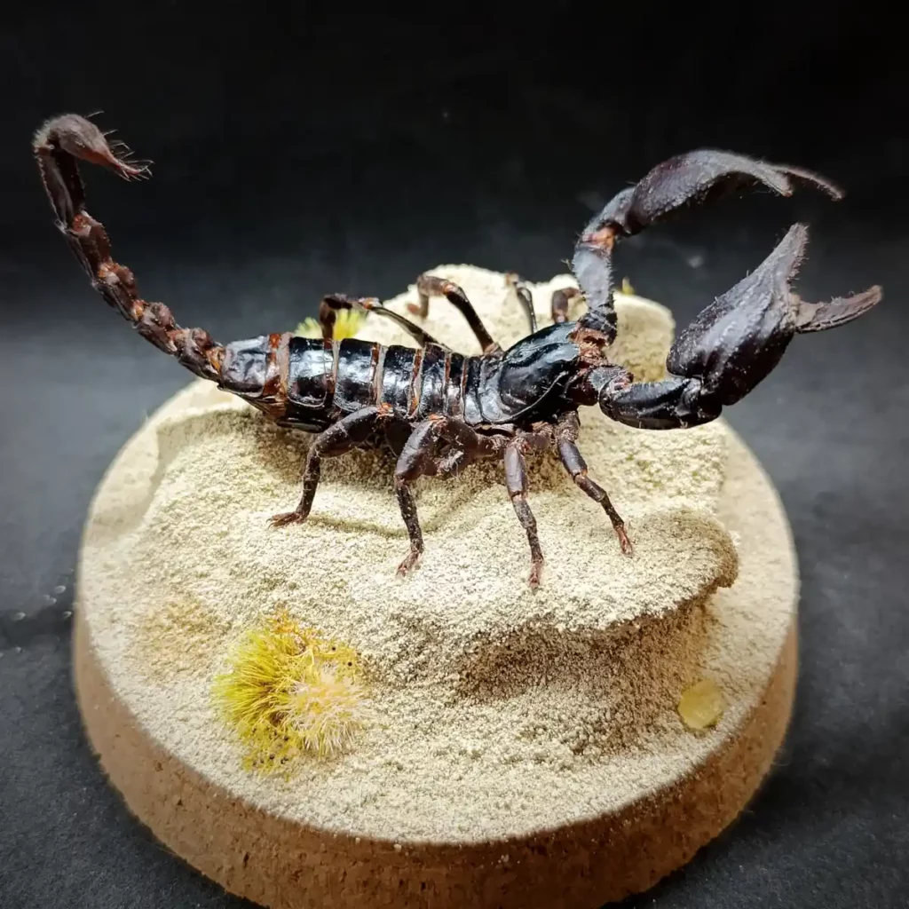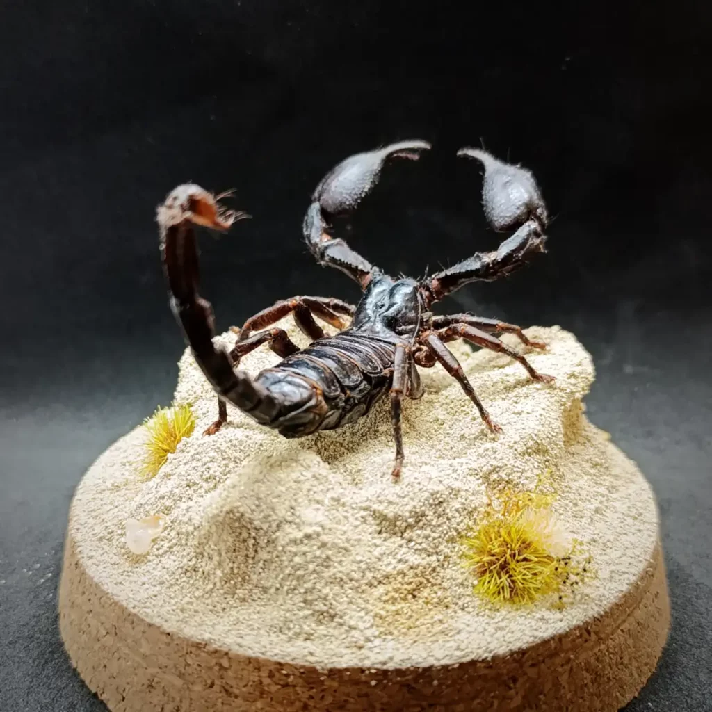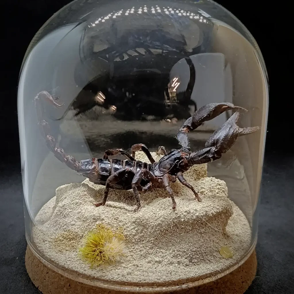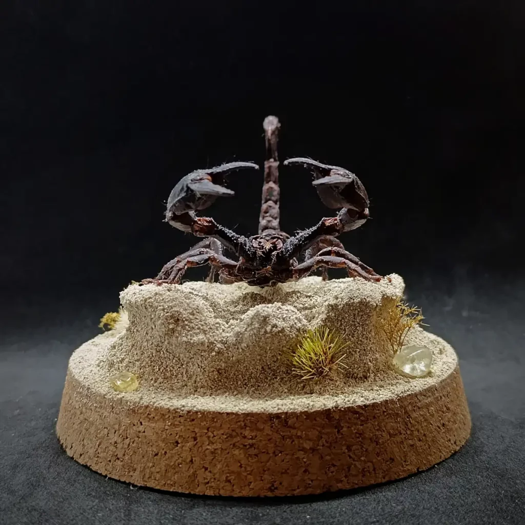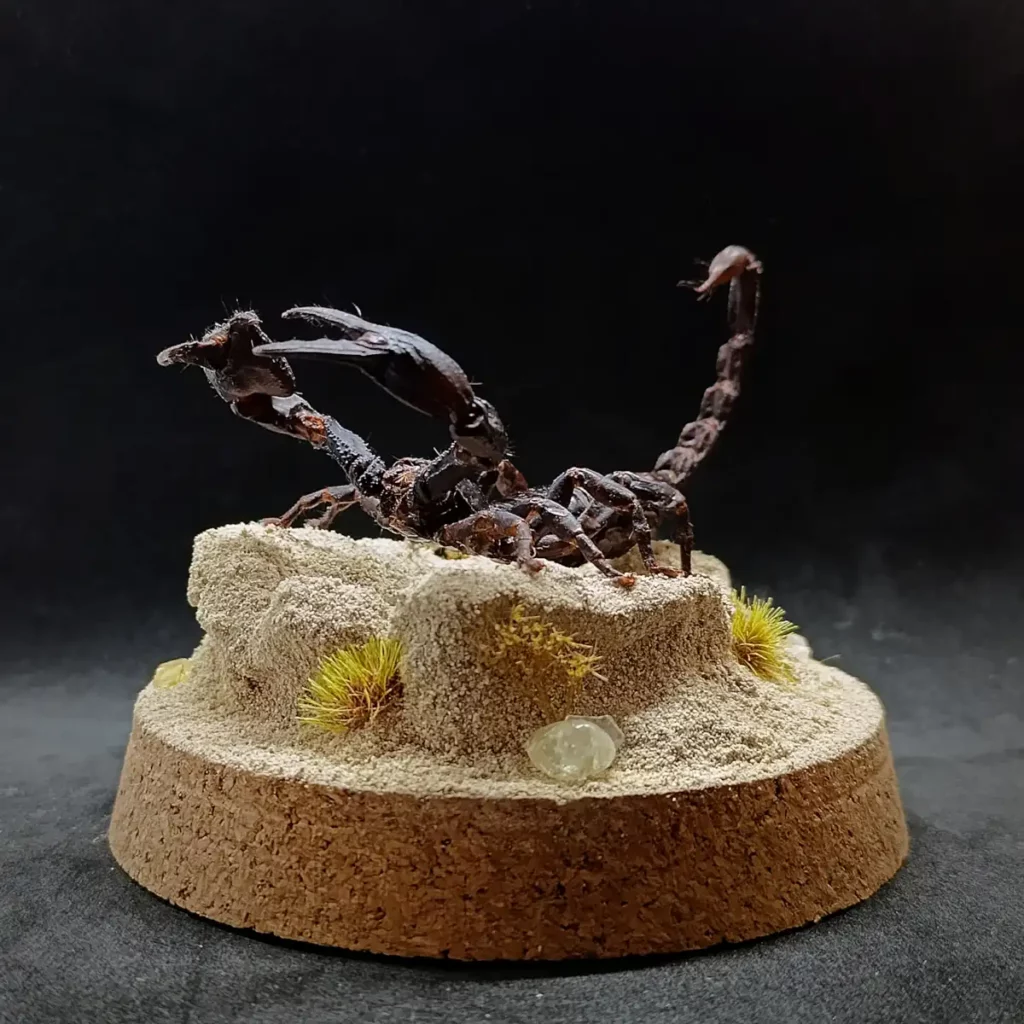 Au centre, un spécimen naturalisé de scorpion Heterometrus sp. se dresse, figé dans une posture réaliste, comme surpris en pleine exploration de son territoire aride.
