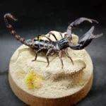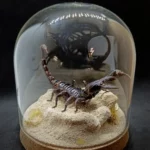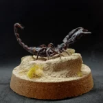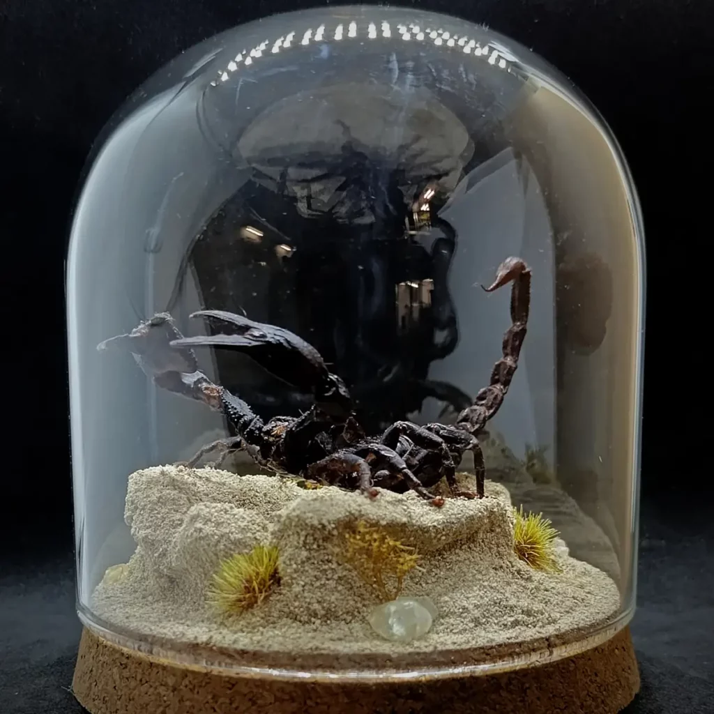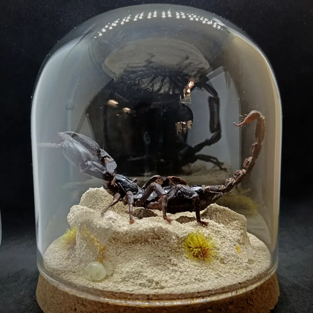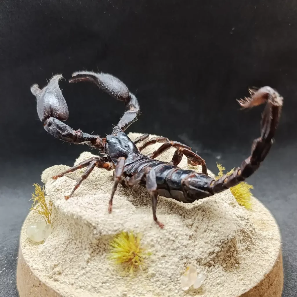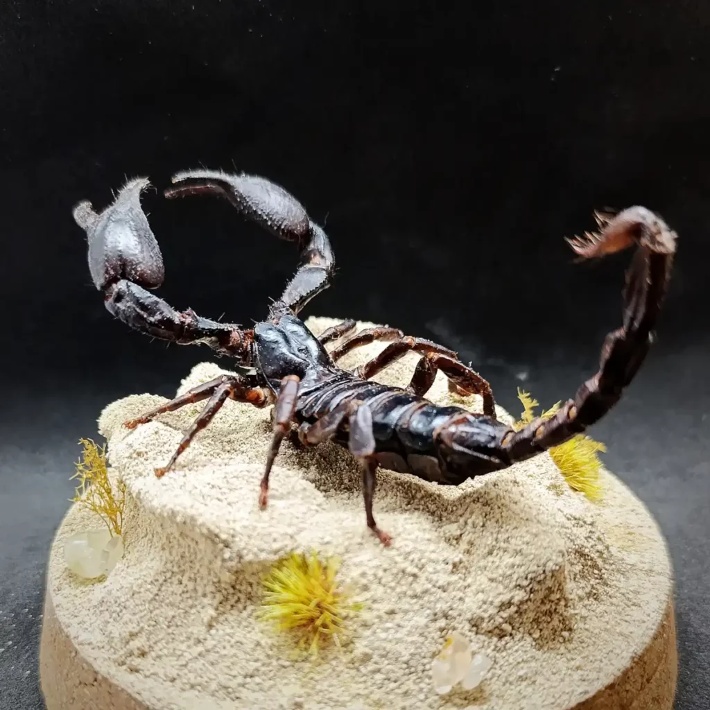 Au centre, un spécimen naturalisé de scorpion Heterometrus sp. se dresse, figé dans une posture réaliste, comme surpris en pleine exploration de son territoire aride.