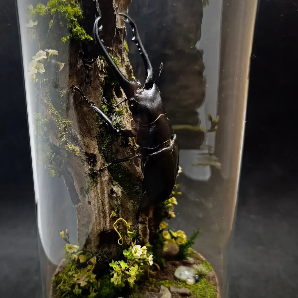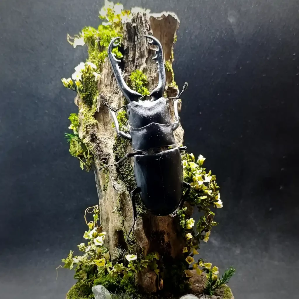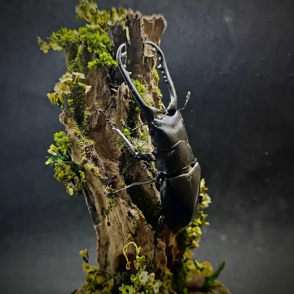 Le décor forestier, composé de végétaux stabilisés, fleurs fines, volutes végétales et textures boisées, crée une ambiance dense et verticale, entre naturalisme et symbolisme. Chaque élément est choisi pour souligner la stature du coléoptère et évoquer une scène sylvestre à la fois brute et raffinée.