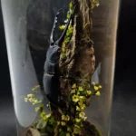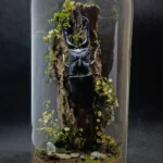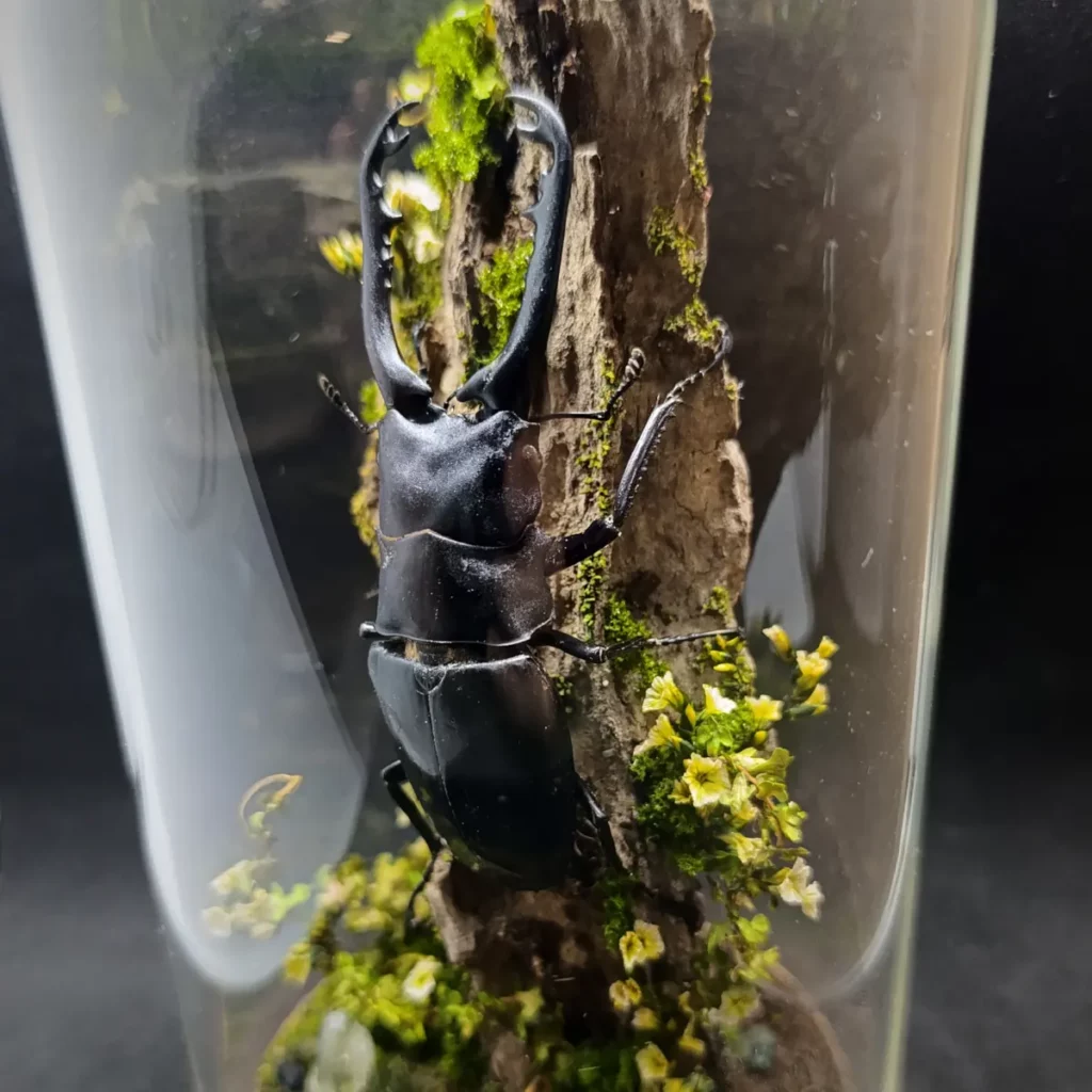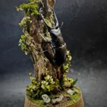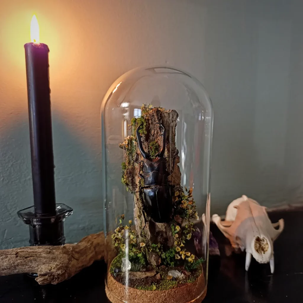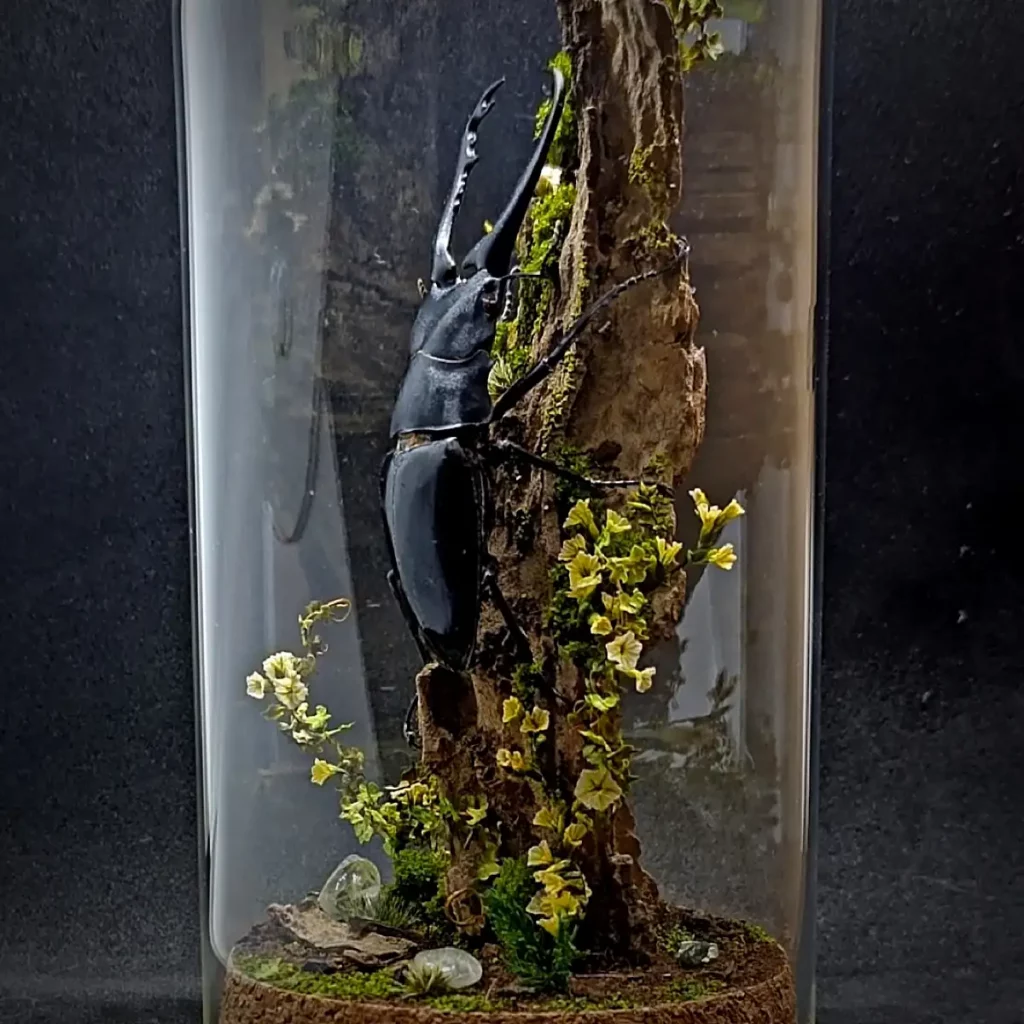 Le décor forestier, composé de végétaux stabilisés, fleurs fines, volutes végétales et textures boisées, crée une ambiance dense et verticale, entre naturalisme et symbolisme. Chaque élément est choisi pour souligner la stature du coléoptère et évoquer une scène sylvestre à la fois brute et raffinée.