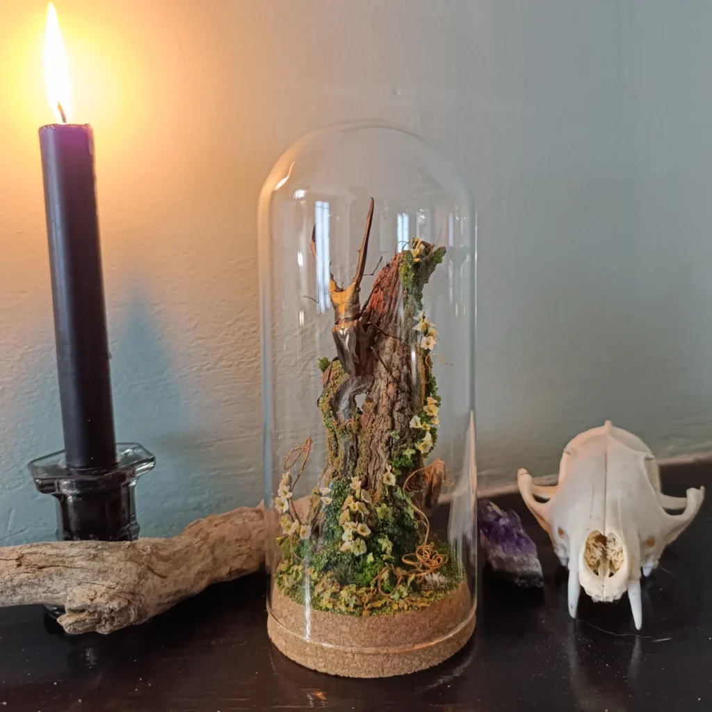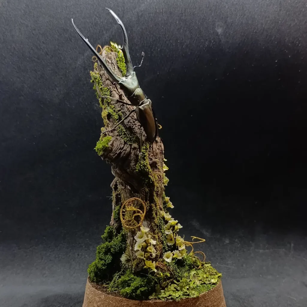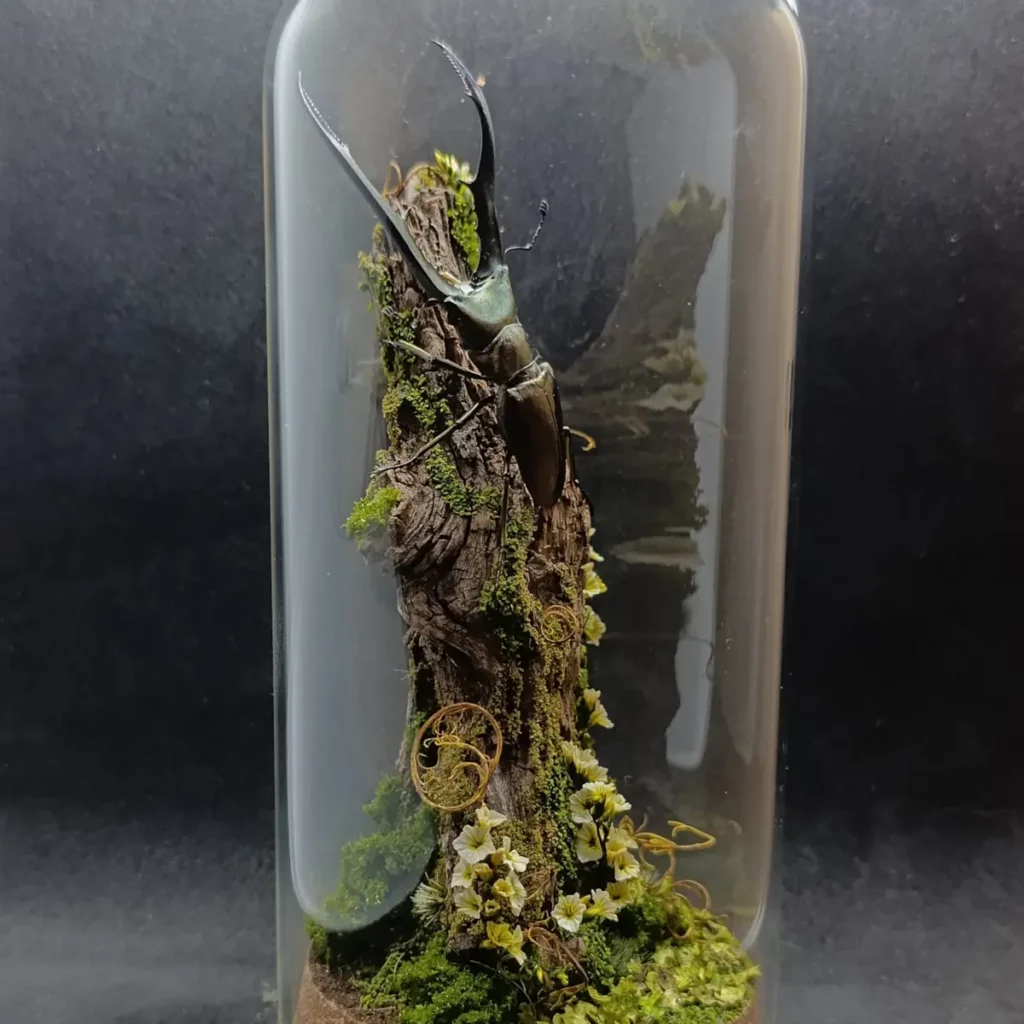 Cette cloche entomologique présente un Cyclommatus metallifer finae naturalisé, lucane originaire d’Indonésie, reconnaissable à ses longues mandibules arquées et à ses reflets métalliques subtils. Le spécimen est fixé sur une branche verticale, comme suspendu dans une clairière miniature.