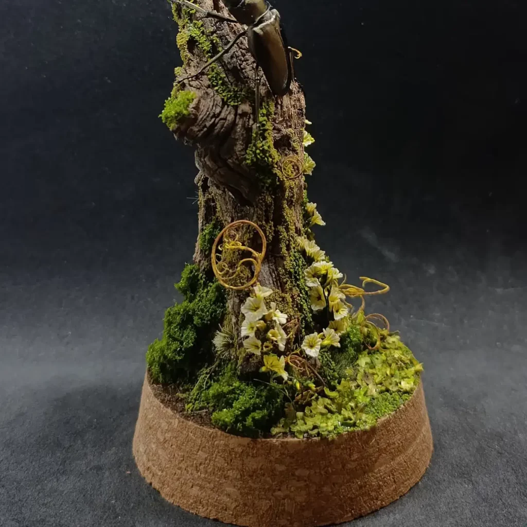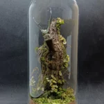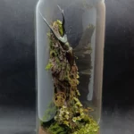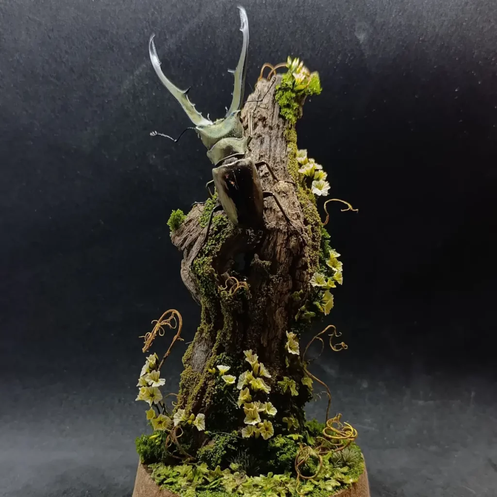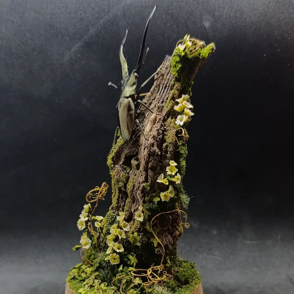 Cette cloche entomologique présente un Cyclommatus metallifer finae naturalisé, lucane originaire d’Indonésie, reconnaissable à ses longues mandibules arquées et à ses reflets métalliques subtils. Le spécimen est fixé sur une branche verticale, comme suspendu dans une clairière miniature.