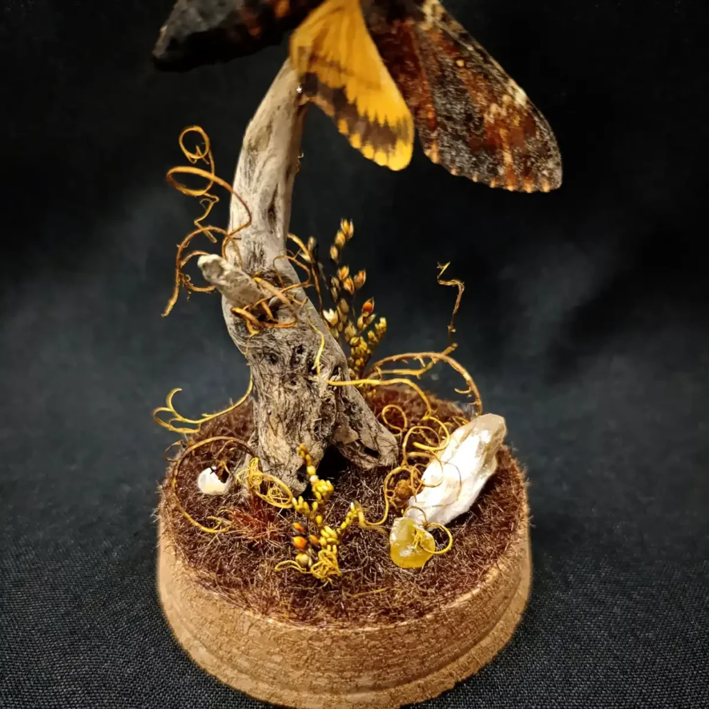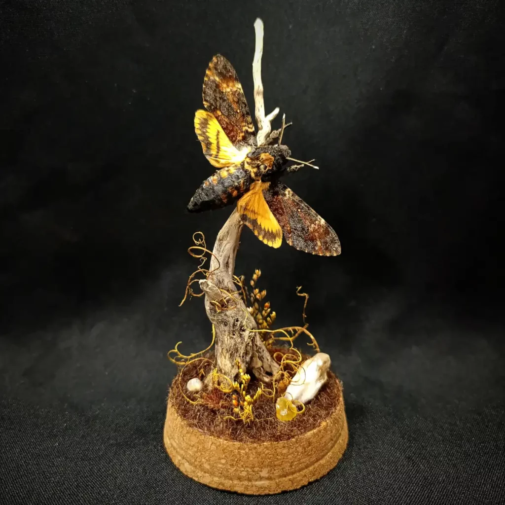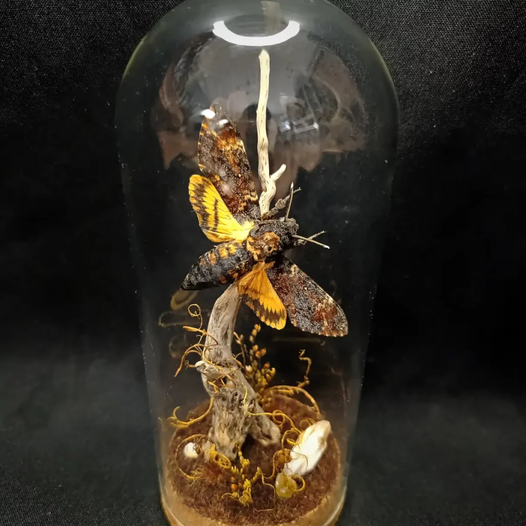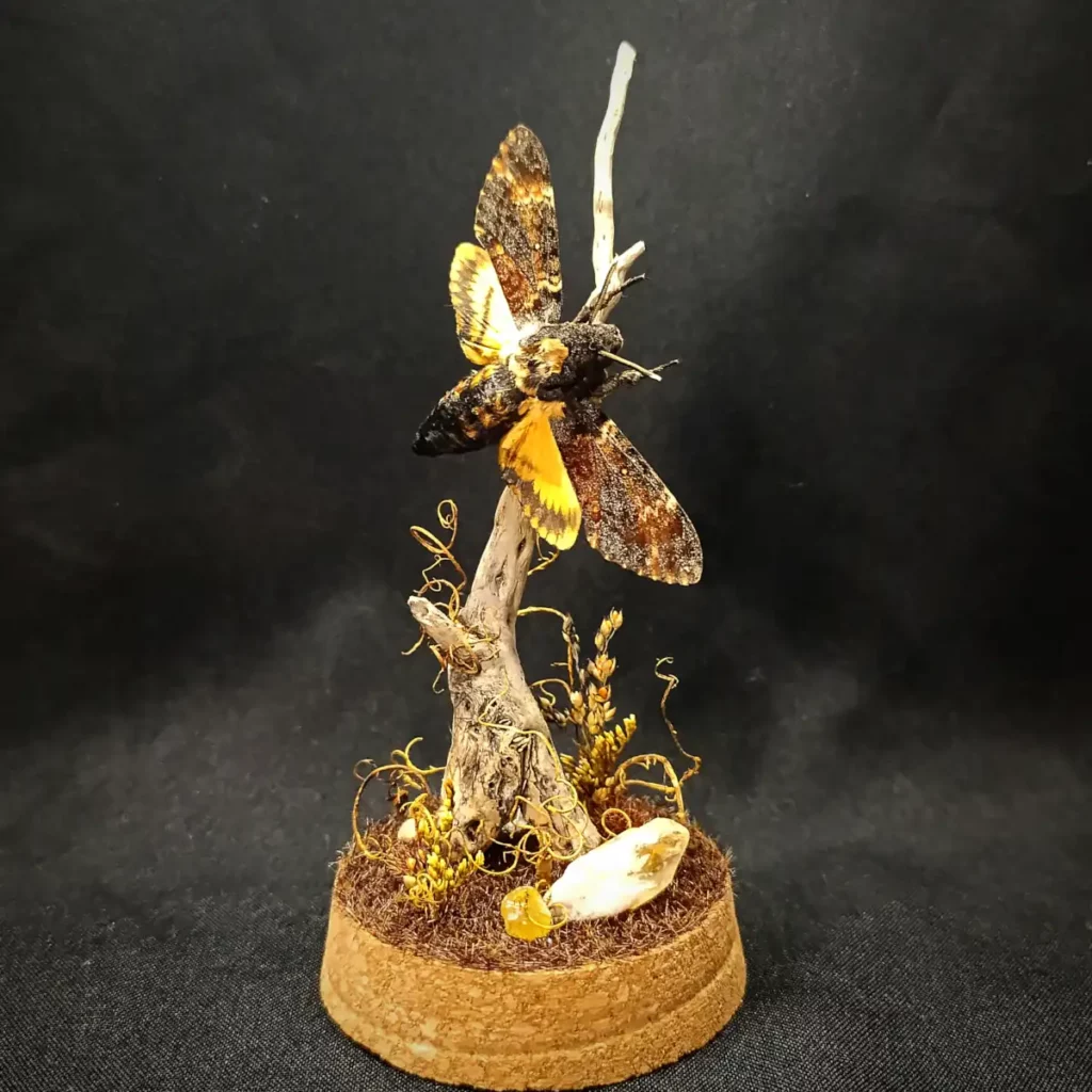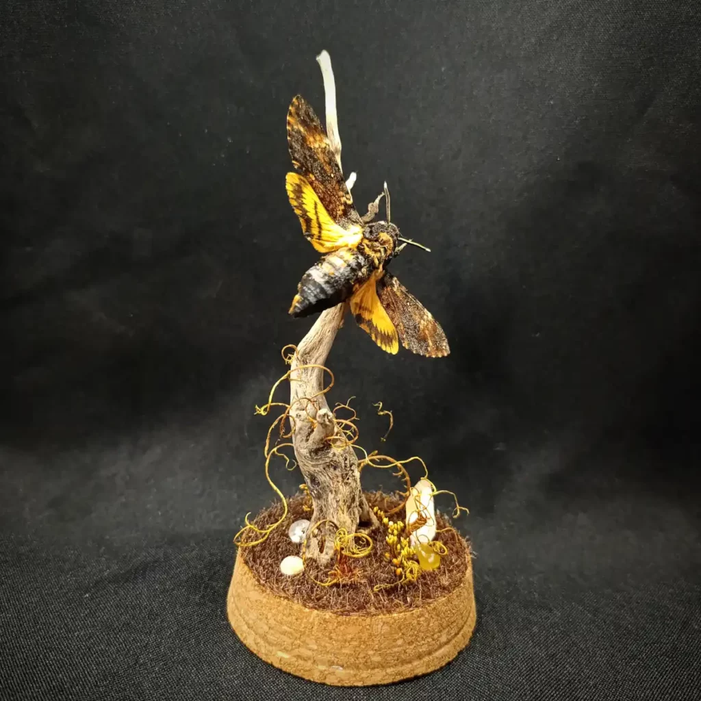 Découvrez cette cloche entomologique mettant en scène le fascinant Sphinx tête de mort (Acherontia atropos), papillon emblématique reconnu pour sa silhouette en forme de crâne. Ce spécimen naturalisé est présenté dans une composition végétale stabilisée, sublimée par un cristal de citrine aux reflets dorés.
