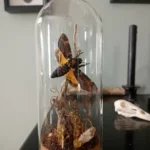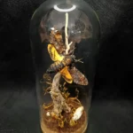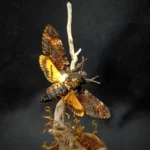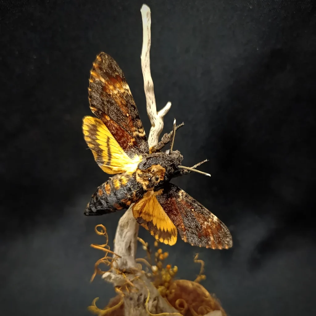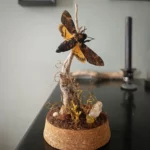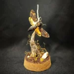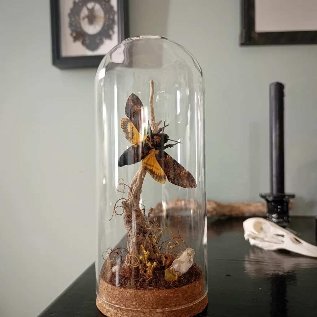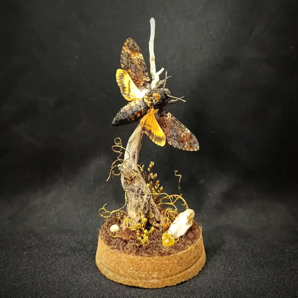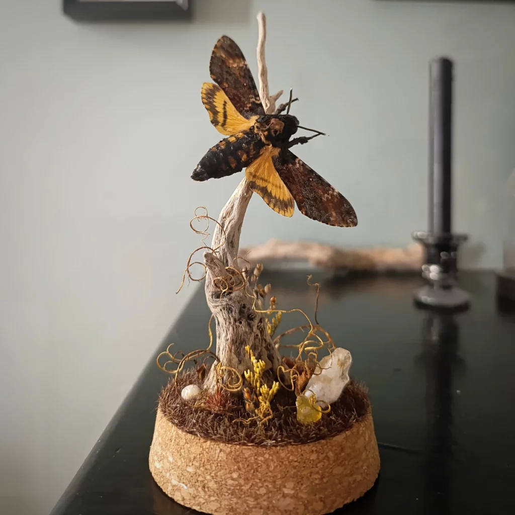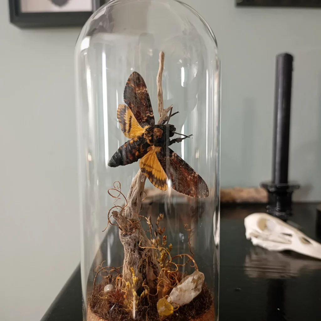 Découvrez cette cloche entomologique mettant en scène le fascinant Sphinx tête de mort (Acherontia atropos), papillon emblématique reconnu pour sa silhouette en forme de crâne. Ce spécimen naturalisé est présenté dans une composition végétale stabilisée, sublimée par un cristal de citrine aux reflets dorés.