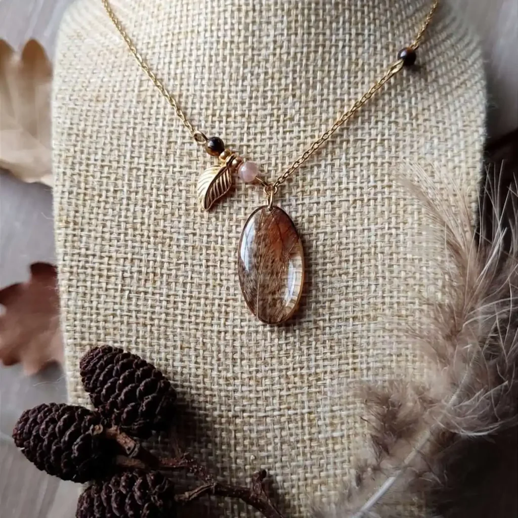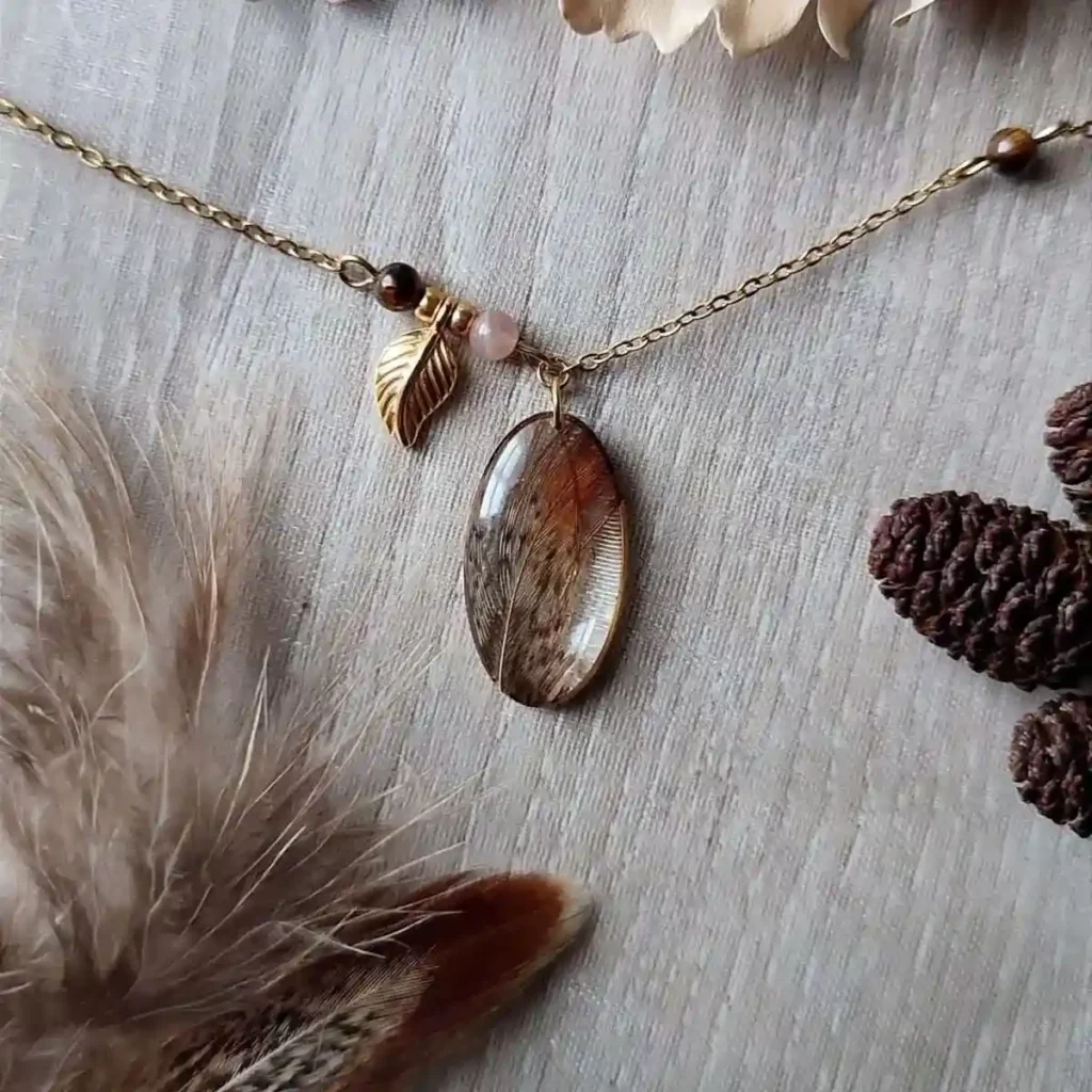 Collier asymétrique en acier inoxydable doré, composé d’un pendentif ovale en résine époxy avec inclusion d’une plume de faisan, de perles de pierre gemme semi précieuse d’oeil de tigre et de pierre du soleil et d’une breloque feuille.