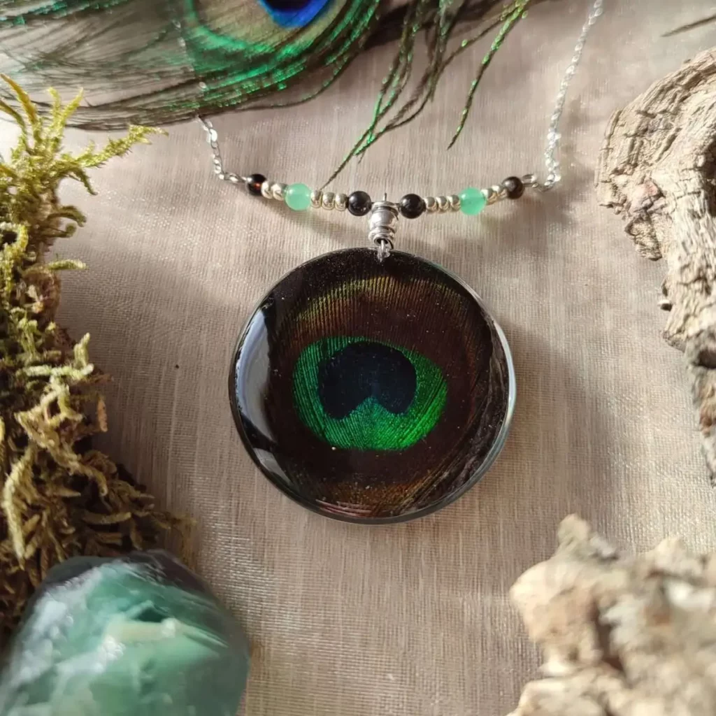 Collier médaillon plume de paon Was Now 80 € Promotion Enter an amount € Add to Cart Add to Cart Collier composé d’une chaîne en acier inoxydable.D’un médaillon en résine époxy avec inclusion d’une plume de paon véritable.De perle de pierre gemme semi précieuse d’aventurine, d’obsidienne, de quartz fumé.De perles miyuki.Pièce unique.