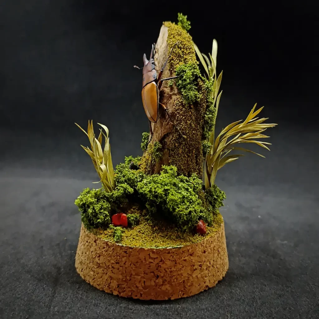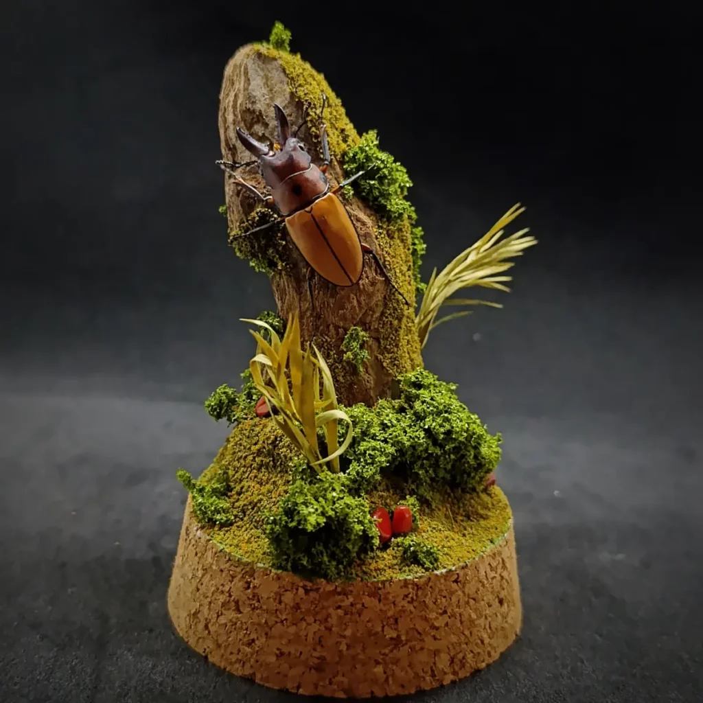 – 🌿 Décor : diorama forestier recréé main (bois, mousses, pierres, feuillages)