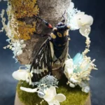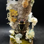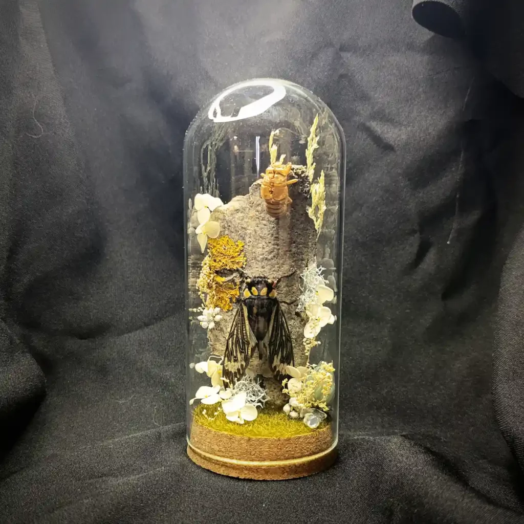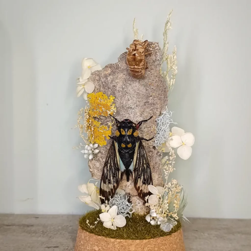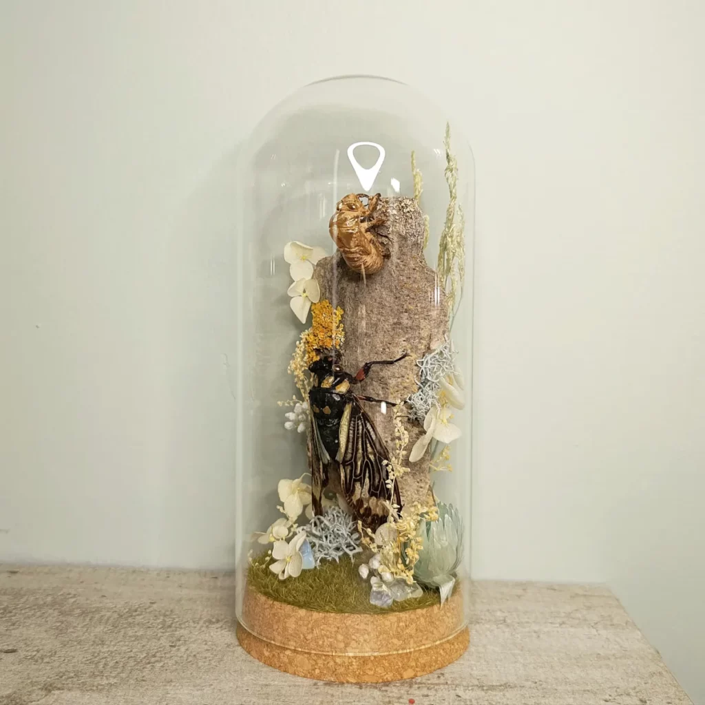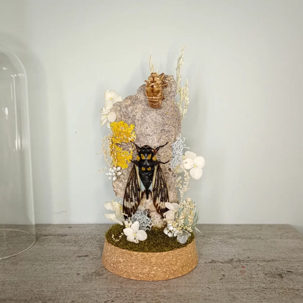 Ce diorama entomologique sous dôme est une pièce unique, mettant en scène une cigale Distantalna splendida naturalisée, accompagnée de son exuvie, dans une composition délicate et poétique.