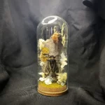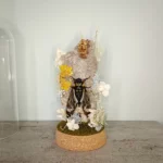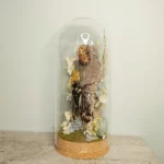 Sous une cloche en verre de 18 cm de hauteur et 8 cm de diamètre, le spécimen repose sur un socle en liège, entouré d’éléments floraux et minéraux soigneusement agencés.