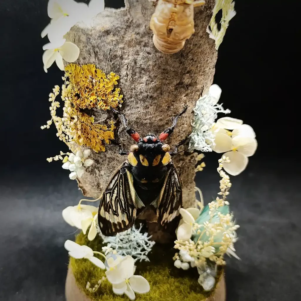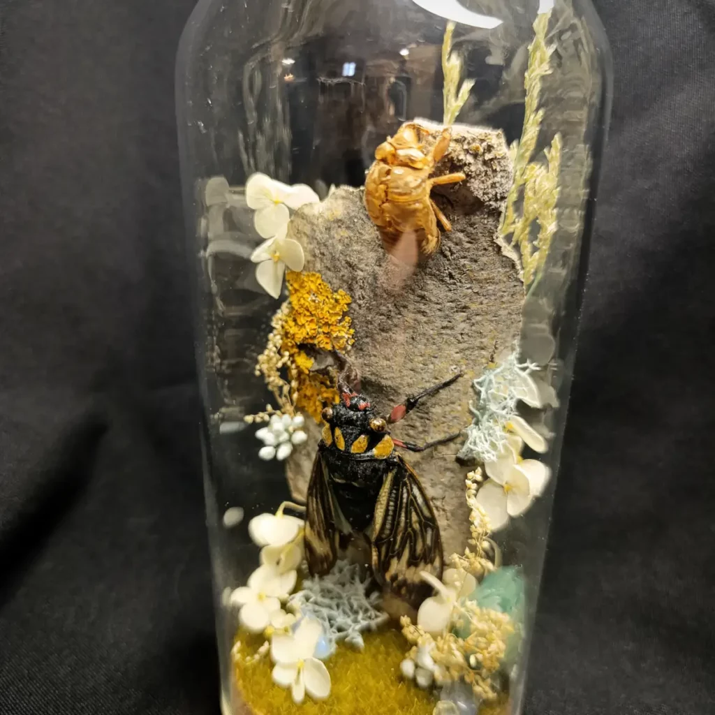 Le décor, créé main, évoque un univers fleuri et contemplatif. La présence de l’exuvie — enveloppe laissée lors de la mue — ajoute une dimension symbolique forte : transformation, passage, mémoire du vivant.