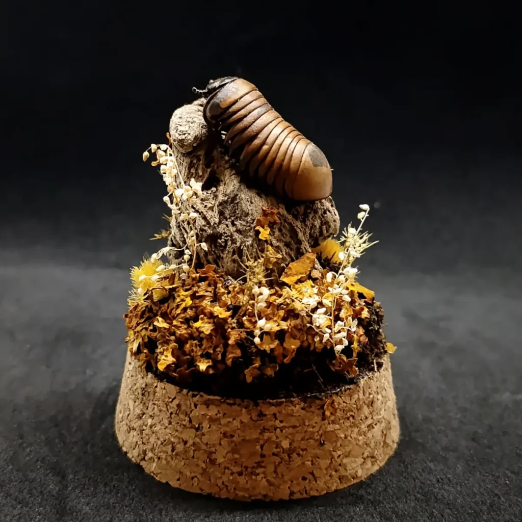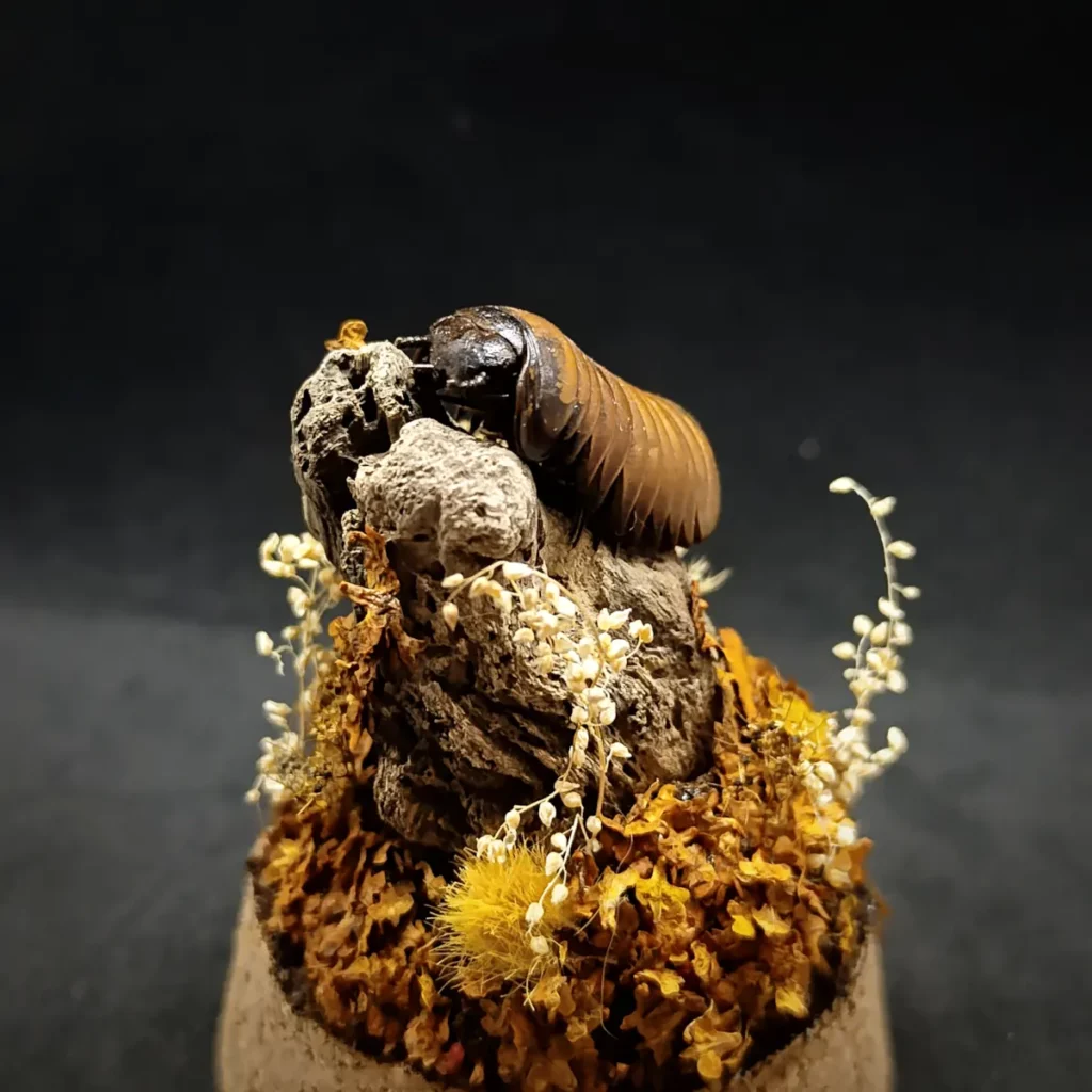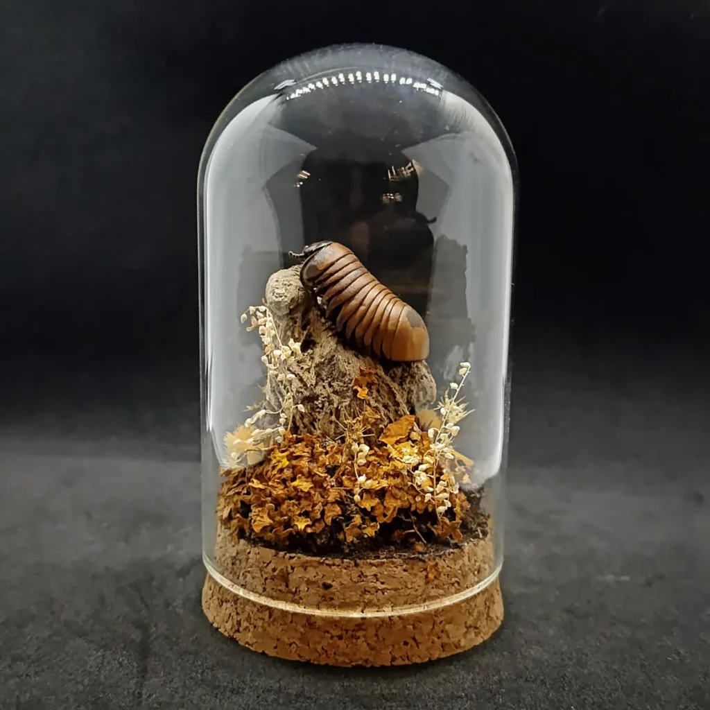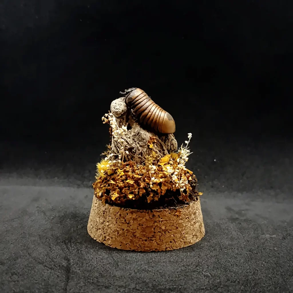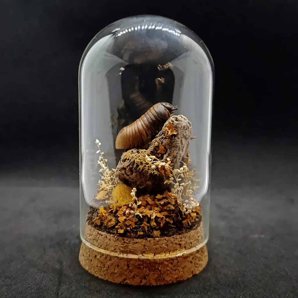 Ce dôme entomologique artisanal met en valeur un Glomeris sp naturalisé, délicatement présenté dans un décor qui recrée son milieu naturel.