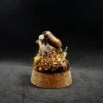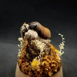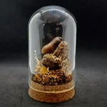 Sous une cloche en verre de 11 cm de hauteur et 6 cm de largeur, le spécimen est entouré d’un décor automnal fait de mousses, fleurs séchées et éléments naturels, évoquant la richesse des sous-bois à la saison des feuilles dorées.