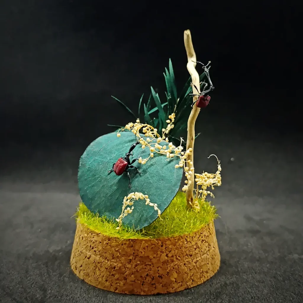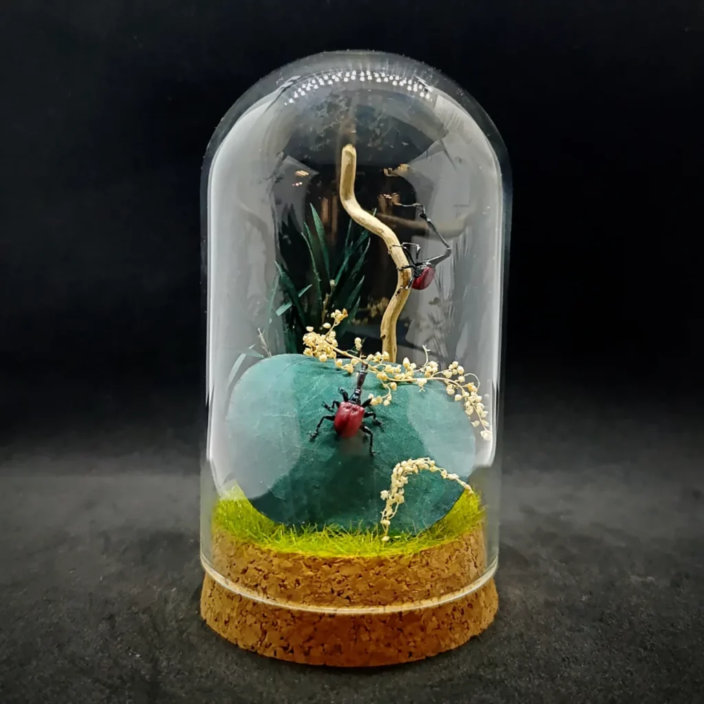 Ce dôme entomologique artisanal met en scène un couple de Trachelophorus giraffa, coléoptères tropicaux fascinants connus pour leur cou élancé et leur allure singulière.