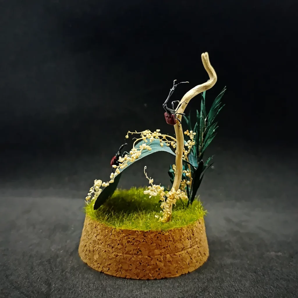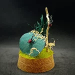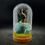Sous une cloche en verre de 11 cm de hauteur et 6 cm de largeur, les deux spécimens naturalisés évoluent dans un décor forestier créé main, inspiré de leur habitat naturel : feuillages, textures végétales et éléments organiques soigneusement agencés.