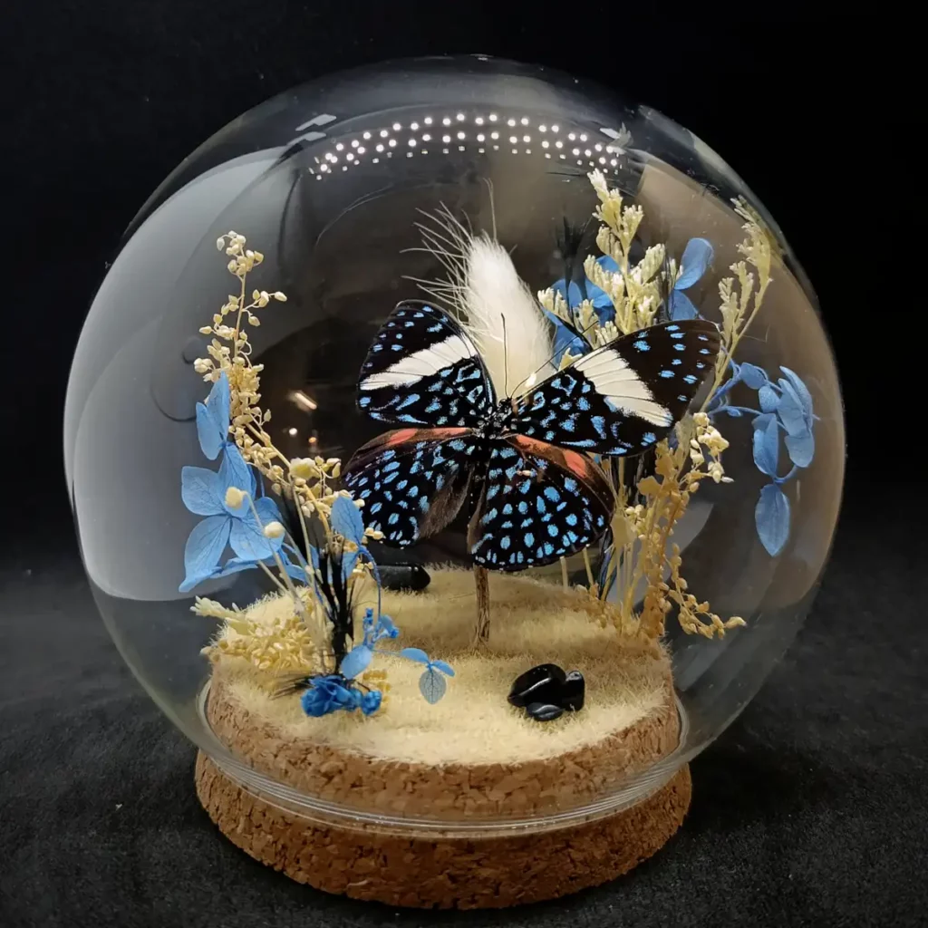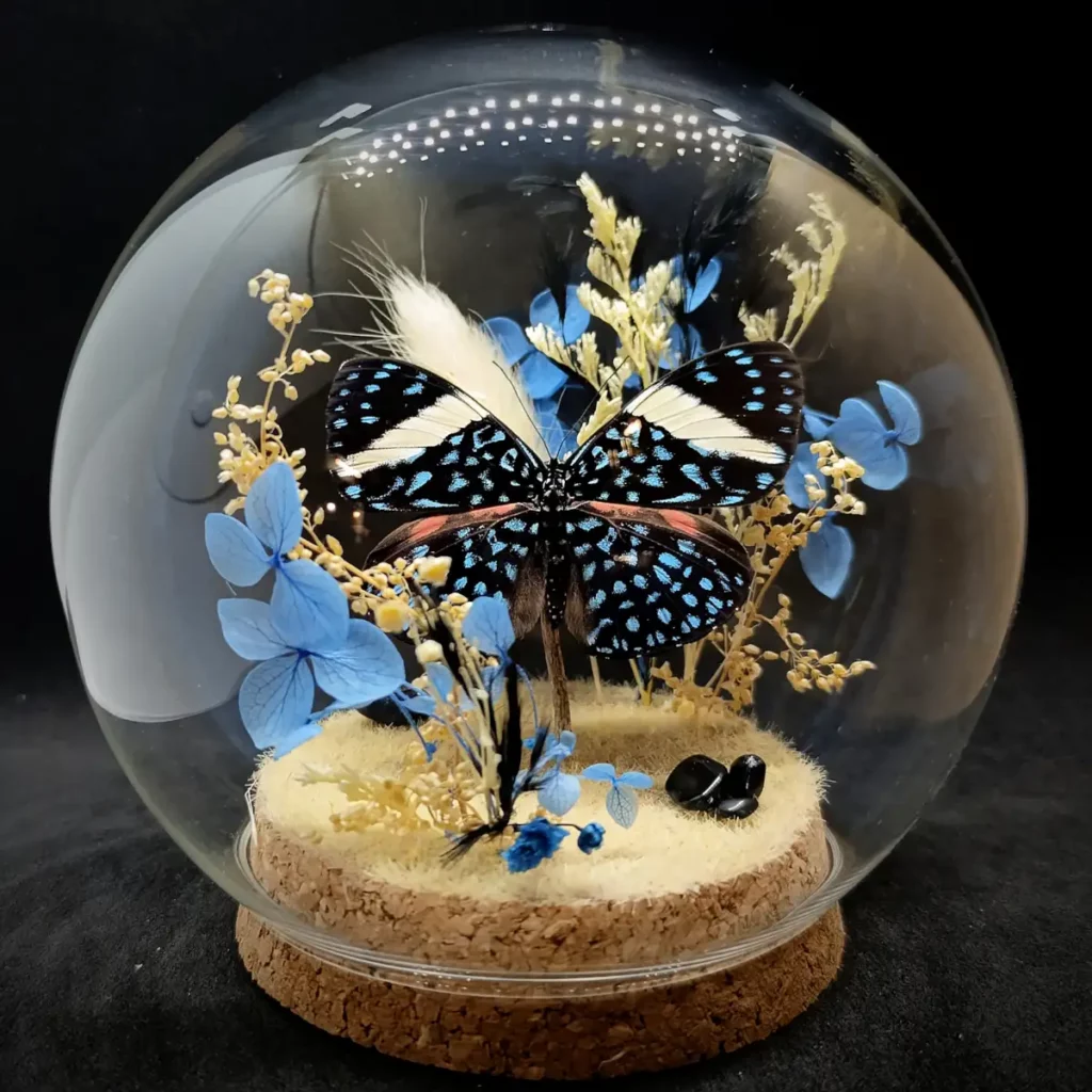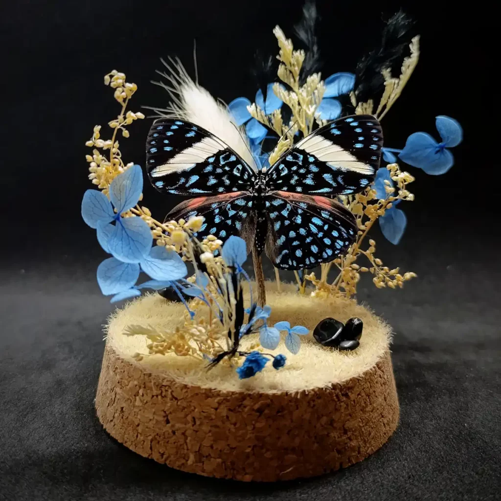 Cette cloche entomologique met en scène un papillon Hamadryas velutina, aux ailes sombres ponctuées de bleu et de blanc. Il repose au cœur d’un décor composé de fleurs séchées, de pierres d’obsidienne et d’un sol texturé couleur sable.