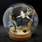 – Matériaux : Fleurs séchées, pierres d’obsidienne, sol texturé, socle en liège, globe en verre