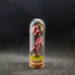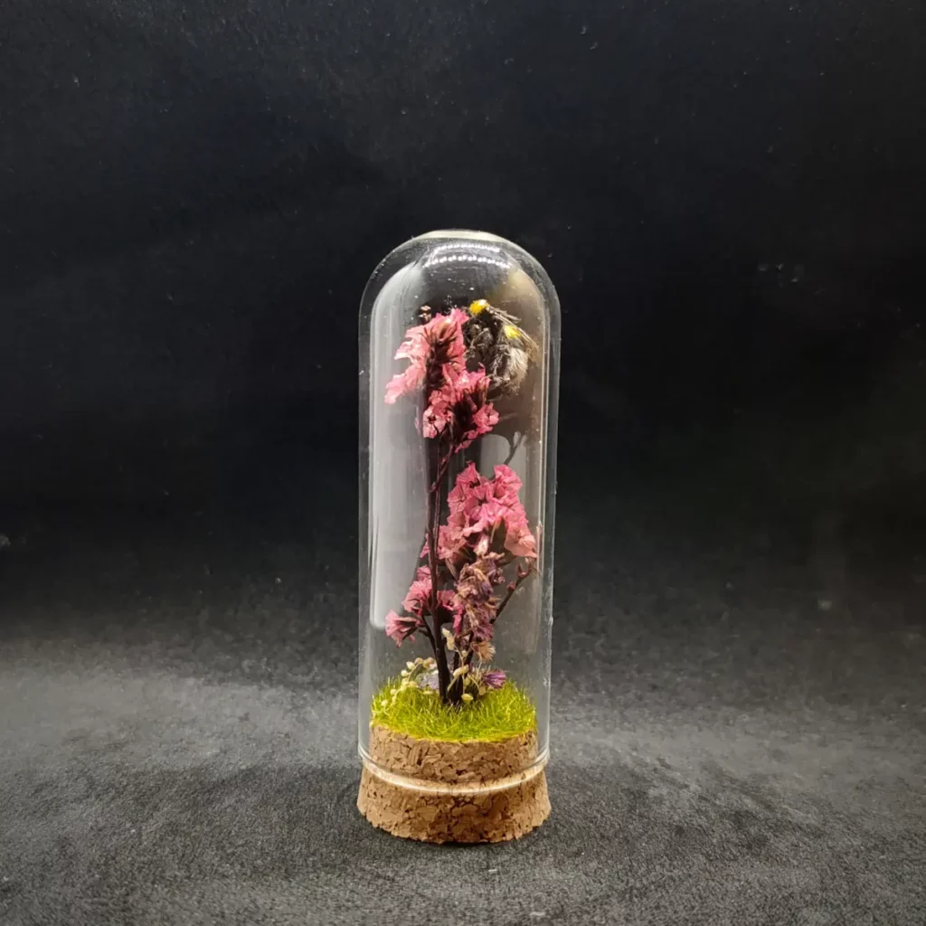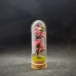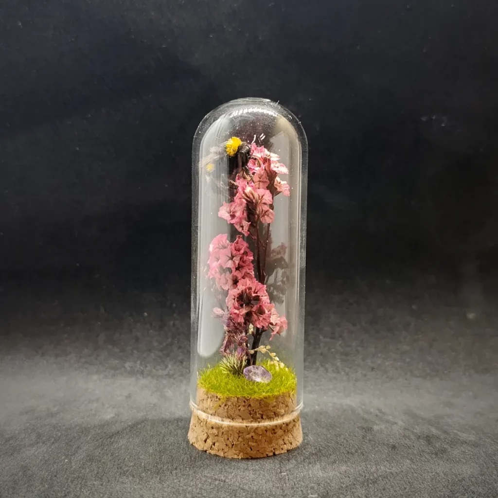Sous une cloche en verre de 9 cm de hauteur et 3 cm de diamètre, le spécimen repose sur un socle en liège, entouré de fleurs séchées et de fragments minéraux choisis pour leur douceur et leur symbolique.