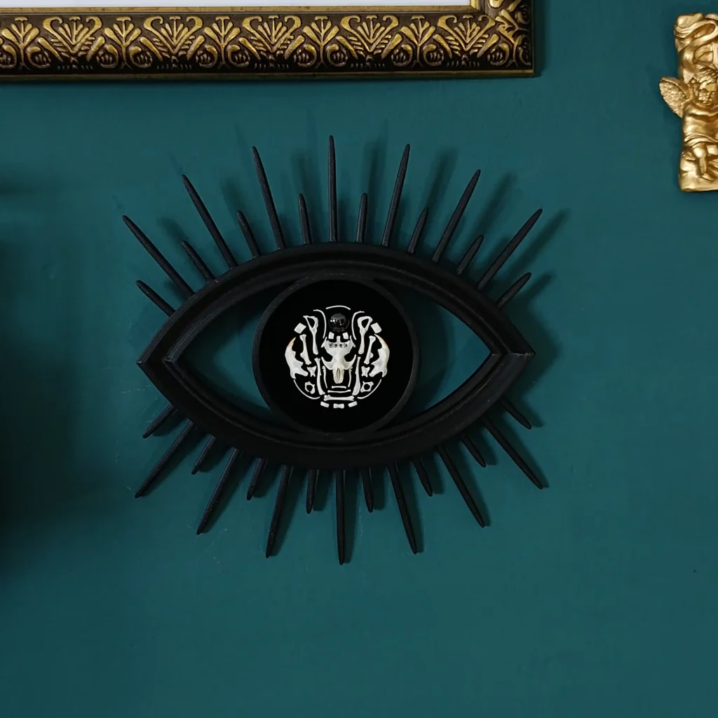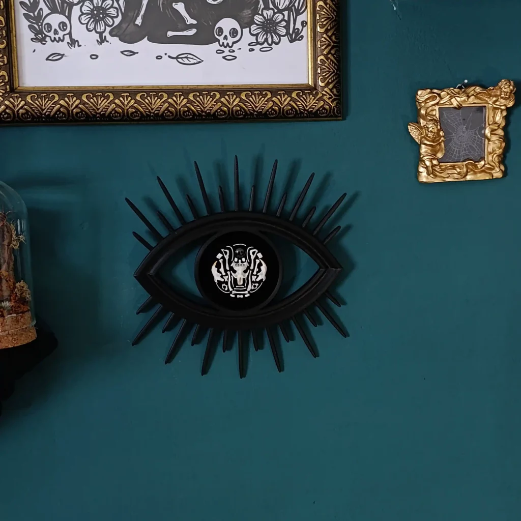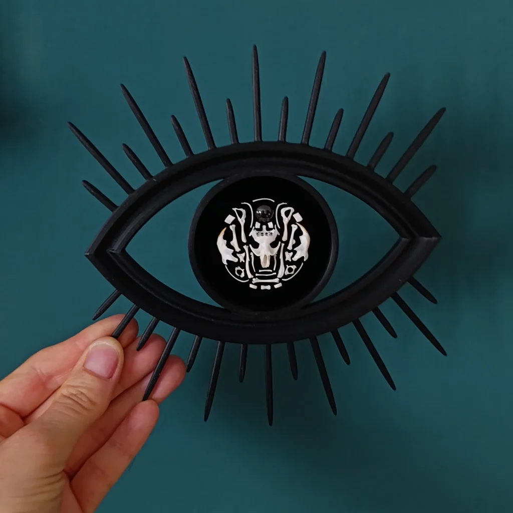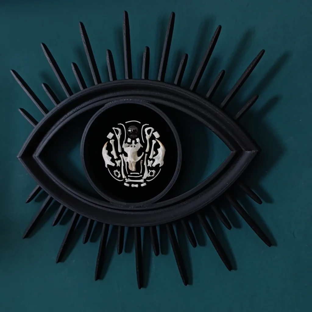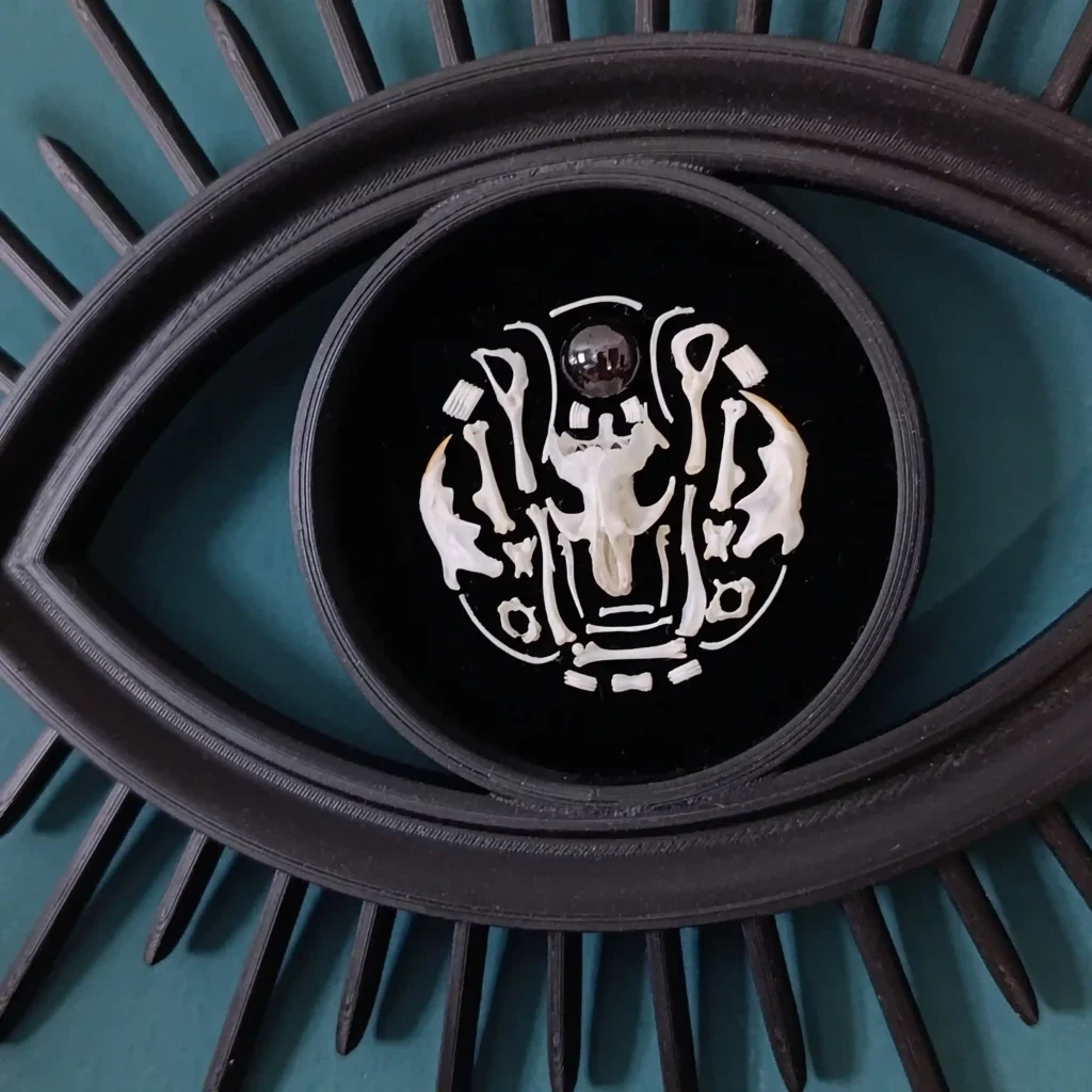 Découvrez un objet de curiosité singulier, entre symbolisme ancien et esthétique contemporaine : un cadre en forme d’œil, entièrement imprimé en PLA et conçu comme une relique moderne. En son centre, une composition minutieuse d’ossements naturels de rongeurs, associés à une pierre véritable de grenat, conférant à la pièce une profondeur organique et minérale unique.