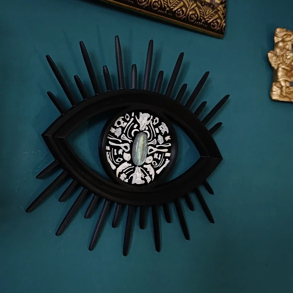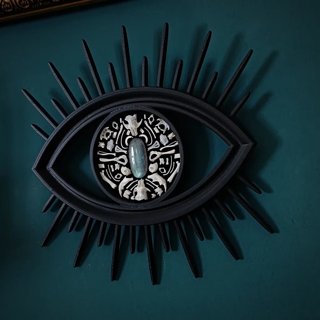 Chaque pièce est entièrement conçue, modélisée et assemblée dans l’atelier des Curiosités de Théia. Le modèle d’œil est une création originale exclusive, pensée comme un écrin symbolique destiné à accueillir des éléments naturels et minéraux.