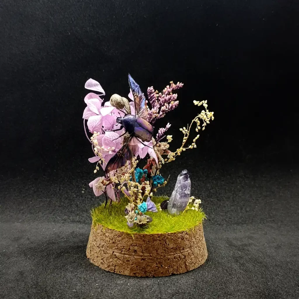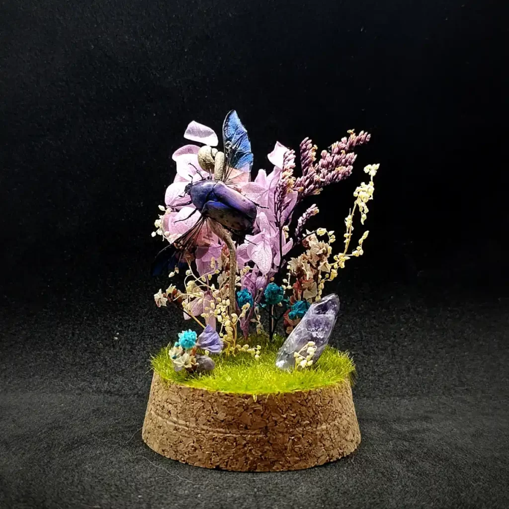 Ce spécimen unique, provenant d’un élevage éthique où il est mort naturellement, est entouré de morceaux de pierre gemme semi-précieuse d’améthyste polie, d’un cristal d’améthyste ainsi que de fleurs naturelles séchées, créant un équilibre harmonieux de couleurs et de textures.