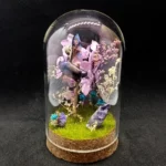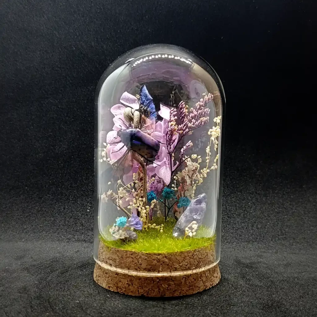 La cétoine est protégée sous une cloche en verre élégante, reposant sur un socle en liège. Avec des dimensions compactes de 10×6 cm, cette création unique est idéale pour apporter une touche naturelle et précieuse à tout espace.
